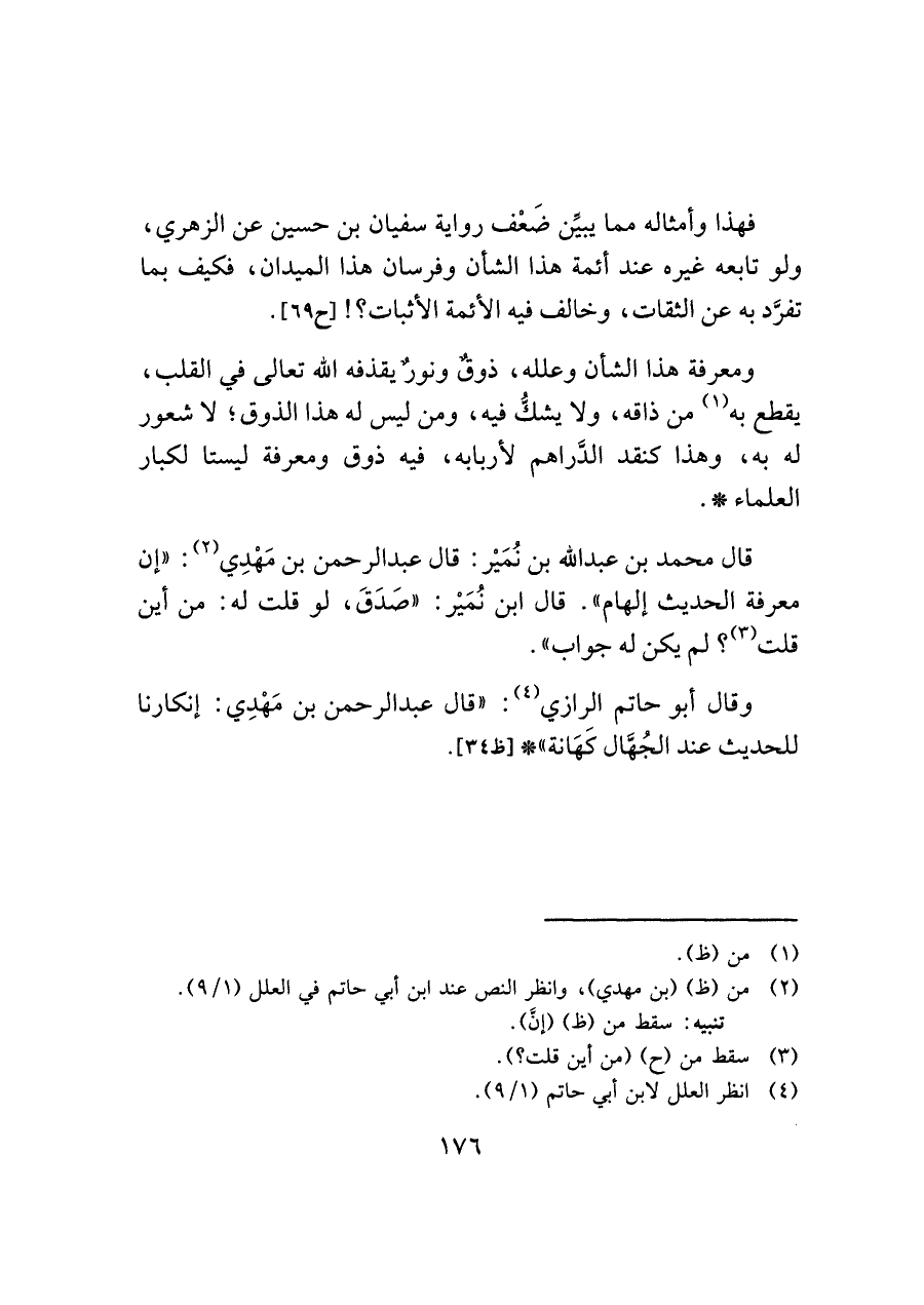 وقال أبو حاتم الرازي (¬٤): "قال عبد الرحمن بن مَهْدِي: إنكارنا للحديث عند الجُهَّال كَهَانة" * [ظ ٣٤].