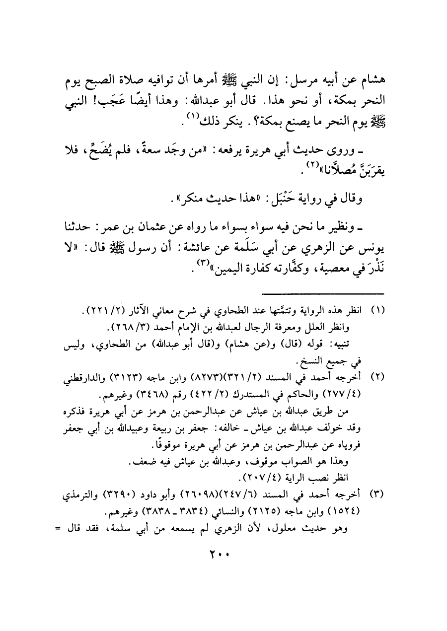 هشام عن أبيه مرسل: إن النبي - صلى الله عليه وسلم - أمرها أن توافيه صلاة الصبح يوم النحر بمكة، أو نحو هذا. قال أبو عبد الله: وهذا أيضًا عَجَب! النبي - صلى الله عليه وسلم - يوم النحر ما يصنع بمكة؟. ينكر ذلك (¬١).