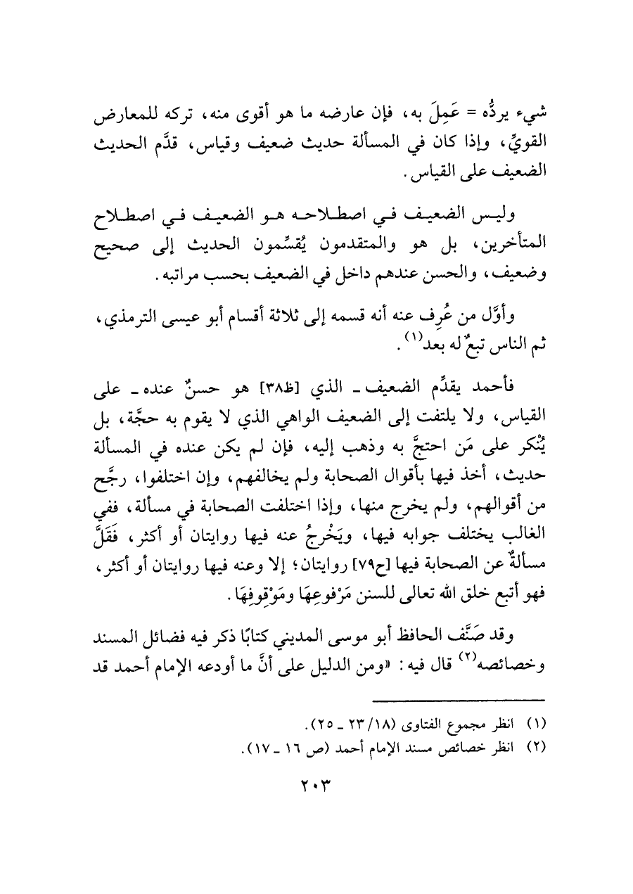 وليس الضعيف في اصطلاحه هو الضعيف في اصطلاح المتأخرين، بل هو والمتقدمون يُقسِّمون الحديث إلى صحيح وضعيف، والحسن عندهم داخل في الضعيف بحسب مراتبه.