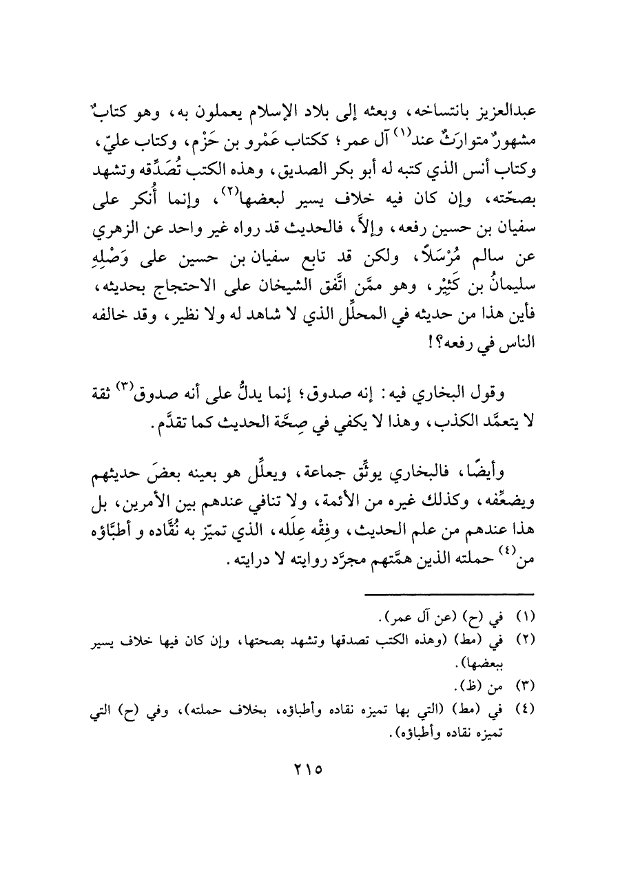 عبد العزيز بانتساخه، وبعثه إلى بلاد الإسلام يعملون به، وهو كتابٌ مشهورٌ متوارَثٌ عند (¬١) آل عمر؛ ككتاب عَمْرو بن حَزْم، وكتاب عليّ، وكتاب أنس الذي كتبه له أبو بكر الصديق، وهذه الكتب تُصَدِّقه وتشهد بصحّته، وإن كان فيه خلاف يسير لبعضها (¬٢)، وإنما أُنكر على سفيان بن حسين رفعه، وإلَّا، فالحديث قد رواه غير واحد عن الزهري عن سالم مُرْسَلًا، ولكن قد تابع سفيان بن حسين على وَصْلِهِ سليمانُ بن كَثيْر، وهو ممَّن اتَّفق الشيخان على الاحتجاج بحديثه، فأين هذا من حديثه في المحلِّل الذي لا شاهد له ولا نظير، وقد خالفه الناس في رفعه؟!
