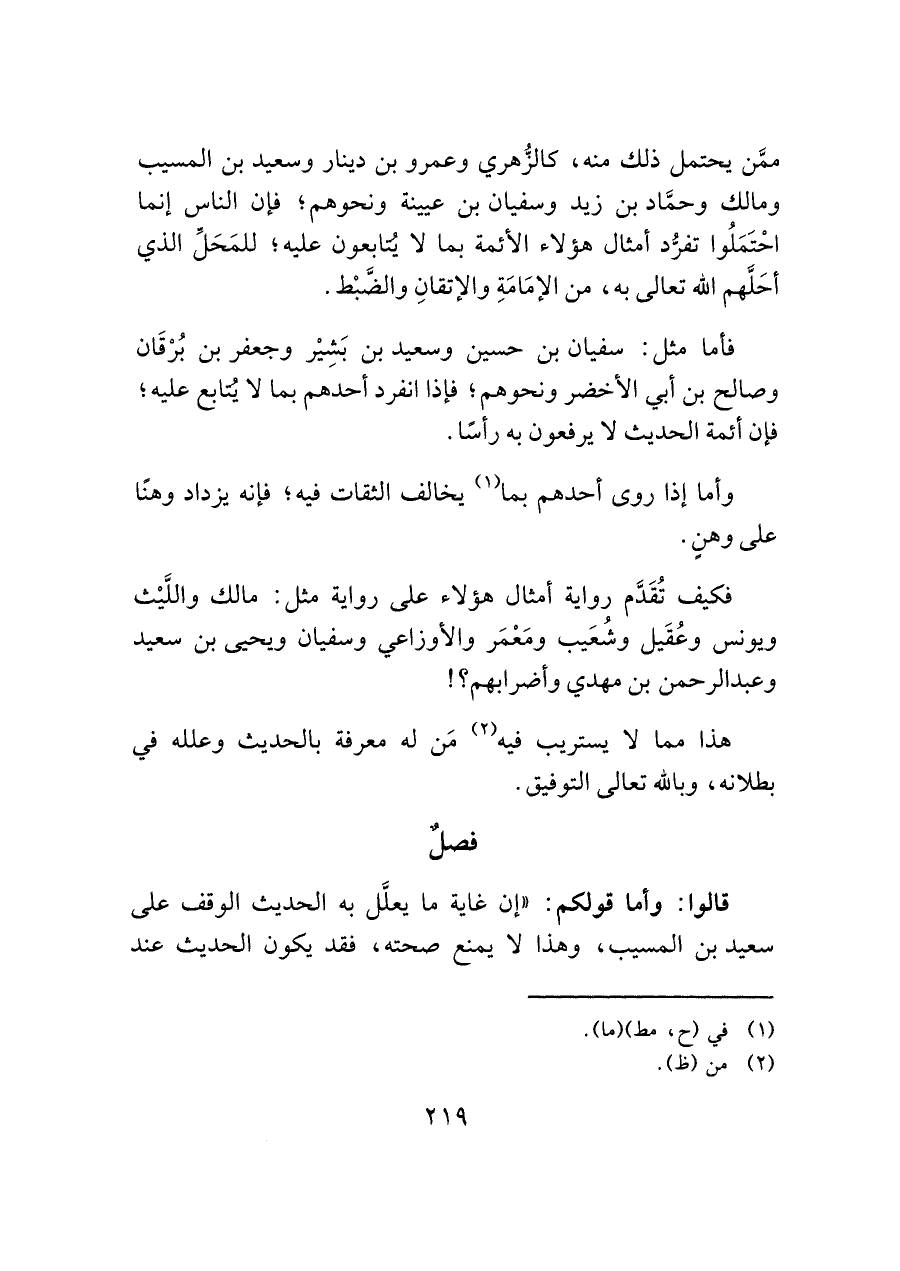 قالوا: وأما قولكم: "إن غاية ما يعلَّل به الحديث الوقف على سعيد بن المسيب، وهذا لا يمنع صحته، فقد يكون الحديث عند