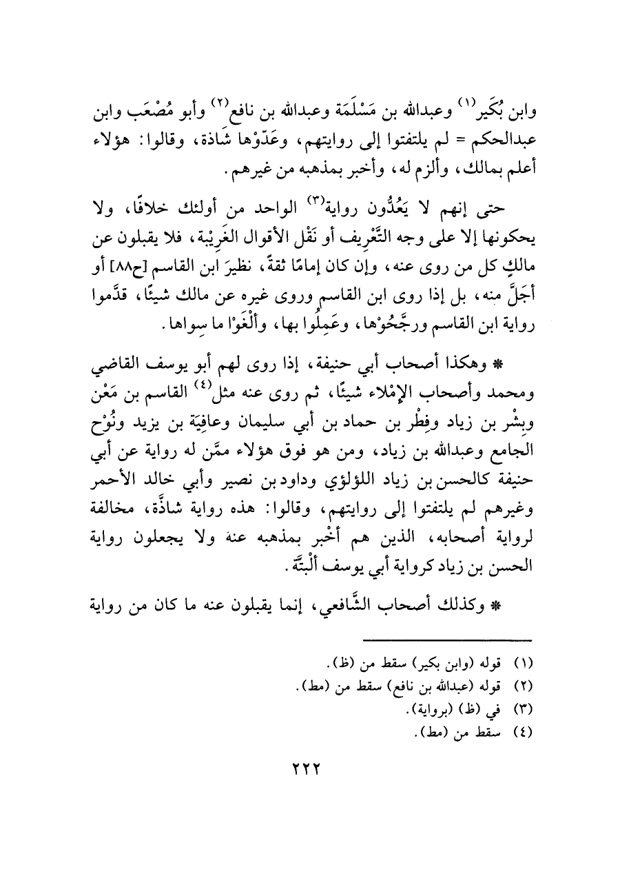 * وهكذا أصحاب أبي حنيفة، إذا روى لهم أبو يوسف القاضي ومحمد وأصحاب الإِمْلاء شيئًا، ثم روى عنه مثل (¬٤) القاسم بن مَعْن وبِشْر بن زياد وفِطْر بن حماد بن أبي سليمان وعافِيَة بن يزيد ونُوْح الجامع وعبد الله بن زياد، ومن هو فوق هؤلاء ممَّن له رواية عن أبي حنيفة كالحسن بن زياد اللؤلؤي وداود بن نصير وأبي خالد الأحمر وغيرهم لم يلتفتوا إلى روايتهم، وقالوا: هذه رواية شاذَّة، مخالفة لرواية أصحابه، الذين هم أخْبر بمذهبه عنه ولا يجعلون رواية الحسن بن زياد كرواية أبي يوسف ألْبتَّة.