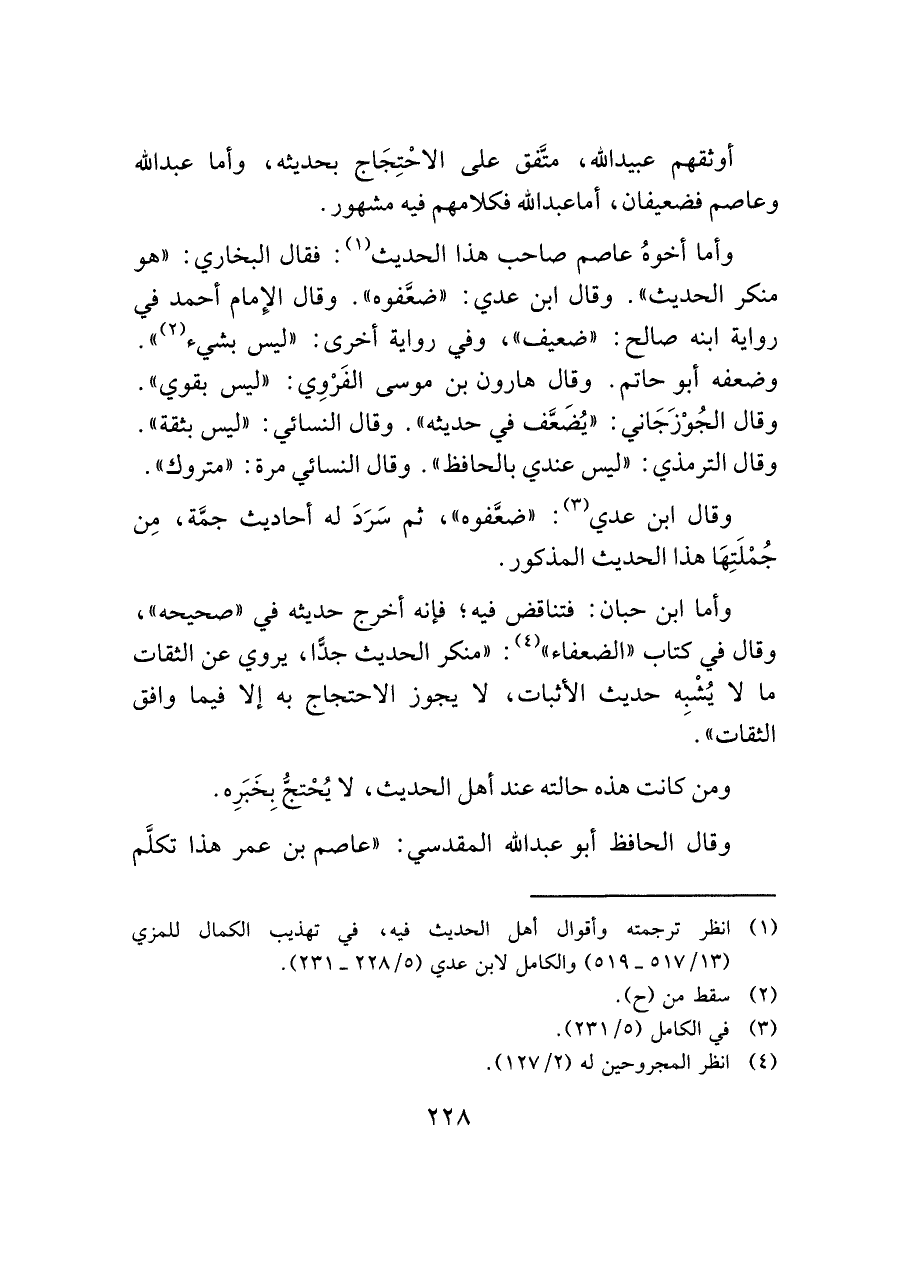 وأما أخوهُ عاصم صاحب هذا الحديث (¬١): فقال البخاري: "هو منكر الحديث". وقال ابن عدي: "ضعَّفوه". وقال الإِمام أحمد في رواية ابنه صالح: "ضعيف"، وفي رواية أخرى: "ليس بشيء (¬٢) ". وضعفه أبو حاتم. وقال هارون بن موسى الفَرْوِي: "ليس بقوي". وقال الجُوْزَجَاني: "يُضَعَّف في حديثه". وقال النسائي: "ليس بثقة". وقال الترمذي: "ليس عندي بالحافظ". وقال النسائي مرة: "متروك".