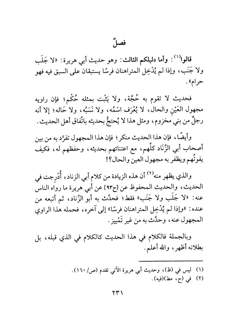 والذي يظهر منه (¬٢) أن هذه الزيادة من كلام أبي الزناد، أُدْرِجت في الحديث، والحديث المحفوظ عن [ح ٩٣] عن أبي هريرة ما رواه الناس عنه: "لا جَلَب ولا جَنَب" فقط؛ فحدَّث به أبو الزِّناد، ثم أتبعه من عنده: "وإذا لم يُدْخِل المتراهنان فرسًا" إلى آخره، فحمله هذا الراوي المجهول عنه، وحدَّث به من غير تَمْييز.