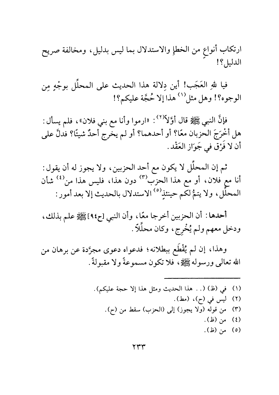 ثم إن المحلِّل لا يكون مع أحد الحزبين، ولا يجوز له أن يقول: أنا مع فلان، أو مع هذا الحزب (¬٣) دون هذا، فليس هذا من (¬٤) شأن المحلِّل، ولا يتمُّ لكم حينئذٍ (¬٥) الاستدلال بالحديث إلا بعد أمور: