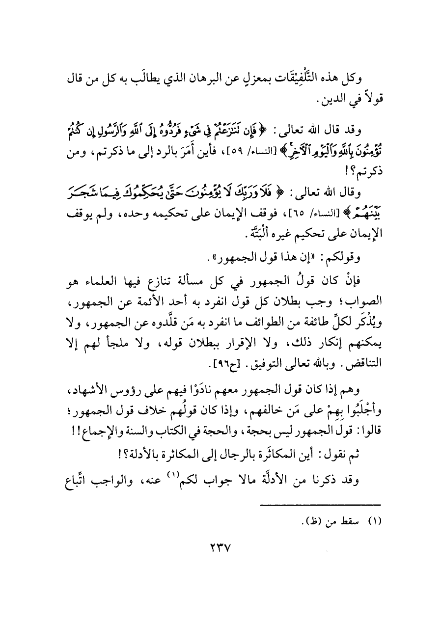وهم إذا كان قول الجمهور معهم نادَوْا فيهم على رؤوس الأشهاد، وأجْلَبُوا بِهِمْ على مَن خالفهم، وإذا كان قولُهم خلاف قول الجمهور؛ قالوا: قول الجمهور ليس بحجة، والحجة في الكتاب والسنة والإِجماع!!
