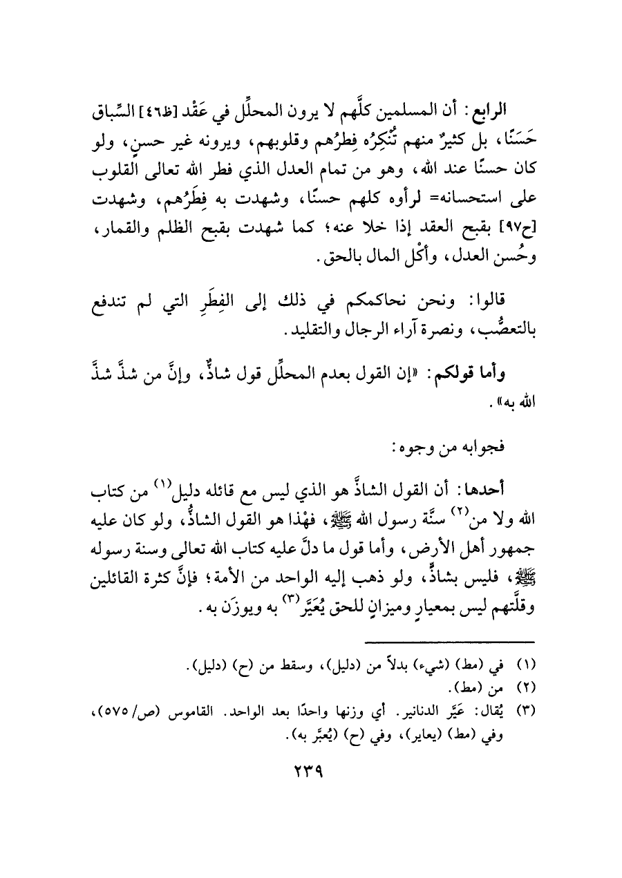 الرابع: أن المسلمين كلَّهم لا يرون المحلِّل في عَقْد [ظ ٤٦] السِّباق حَسَنًا، بل كثيرٌ منهم تُنْكِرُه فِطرُهم وقلوبهم، ويرونه غير حسنٍ، ولو كان حسنًا عند الله، وهو من تمام العدل الذي فطر الله تعالى القلوب على استحسانه = لرأوه كلهم حسنًا، وشهدت به فِطَرُهم، وشهدت [ح ٩٧] بقبح العقد إذا خلا عنه؛ كما شهدت بقبح الظلم والقمار، وحُسن العدل، وأكْل المال بالحق.