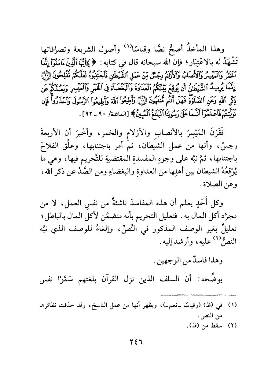 وهذا المأخذُ أصحُّ نصًّا وقياسًا (¬١) وأصول الشريعة وتصرُّفاتها تَشْهَدُ له بالاعْتِبَار؛ فإن الله سبحانه قال في كتابه: {يَاأَيُّهَا الَّذِينَ آمَنُوا إِنَّمَا الْخَمْرُ وَالْمَيْسِرُ وَالْأَنْصَابُ وَالْأَزْلَامُ رِجْسٌ مِنْ عَمَلِ الشَّيْطَانِ فَاجْتَنِبُوهُ لَعَلَّكُمْ تُفْلِحُونَ (٩٠) إِنَّمَا يُرِيدُ الشَّيْطَانُ أَنْ يُوقِعَ بَيْنَكُمُ الْعَدَاوَةَ وَالْبَغْضَاءَ فِي الْخَمْرِ وَالْمَيْسِرِ وَيَصُدَّكُمْ عَنْ ذِكْرِ اللَّهِ وَعَنِ الصَّلَاةِ فَهَلْ أَنْتُمْ مُنْتَهُونَ (٩١) وَأَطِيعُوا اللَّهَ وَأَطِيعُوا الرَّسُولَ وَاحْذَرُوا فَإِنْ تَوَلَّيْتُمْ فَاعْلَمُوا أَنَّمَا عَلَى رَسُولِنَا الْبَلَاغُ الْمُبِينُ} [المائدة: ٩٠ - ٩٢].