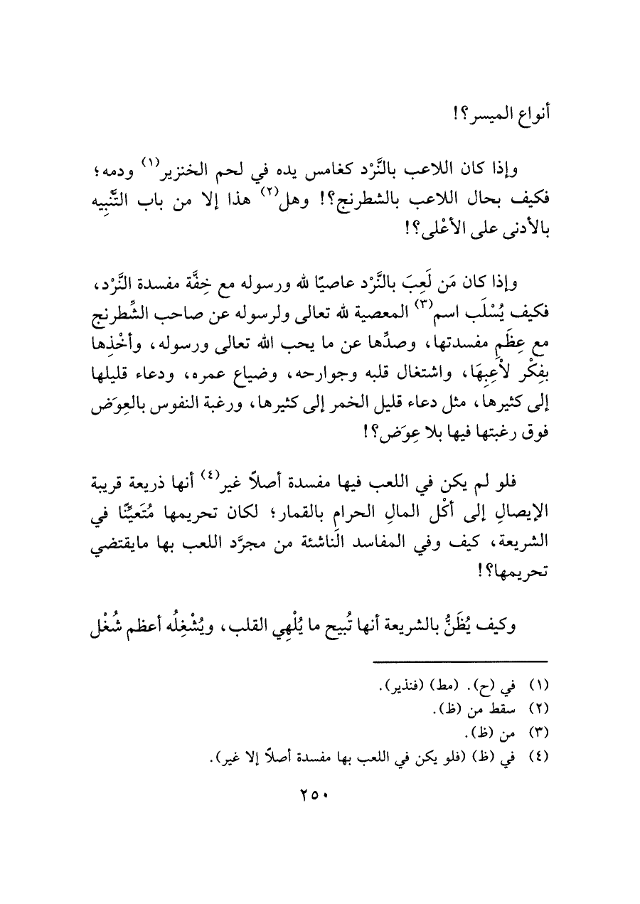 فلو لم يكن في اللعب فيها مفسدة أصلًا غير (¬٤) أنها ذريعة قريبة الإيصالِ إلى أكْل المالِ الحرامِ بالقمار؛ لكان تحريمها مُتَعيِّنًا في الشريعة، كيف وفي المفاسد الناشئة من مجرَّد اللعب بها ما يقتضي تحريمها؟!