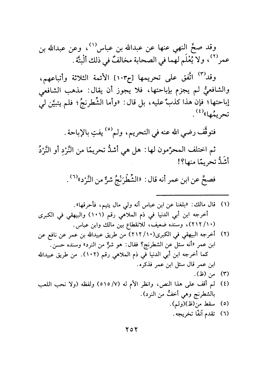 (¬٢) أخرجه البيهقي في الكبرى (١٠/ ٢١٢) من طريق عبيد الله بن عمر عن نافع عن ابن عمر "أنه سئل عن الشطرنج؟ فقال: هو شرٌّ من النرد" وسنده حسن.