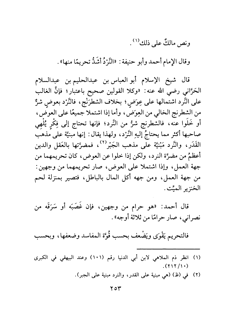 قال شيخ الإسلام أبو العباس بن عبد الحليم بن عبد السلام الحَرَّاني رضي الله عنه: "وكلا القولين صحيح باعتبار؛ فإنَّ الغالب على النَّرد اشتمالها على عِوَضٍ؛ بخلاف الشطرَنْج، فالنَّرْد بعوضٍ شرٌّ من الشطرنج الخالي من العِوَض، وأما إذا اشتملا جميعًا على العوض، أو خَلَوا عنه، فالشطرنج شرُّ من النَّرد؛ فإنها تحتاج إلى فِكْرٍ يُلْهِي صاحبها أكثر مما يحتاجُ إليهِ النَّرْد، ولهذا يقال: إنها مبنيَّة على مذهب القَدَر، والنَّرد مَبْنيَّة على مذهب الجَبْر (¬٢)، فمضرَّتها بالعَقل والدين أعظمُ من مضرَّة النرد، ولكن إذا خلوا عن العوض، كان تحريمهما من جهة العمل، وإذا اشتملا على العوض، صار تحريمهما من وجهين: من جهة العمل، ومن جهه أكل المال بالباطل، فتصير بمنزلة لحم الخنزير الميِّت.