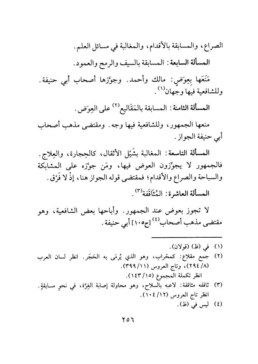 المسألة التاسعة: المغالبة بشَيْل الأثقال، كالحِجارة، والعِلاج. فالجمهور لا يجوِّزون العوض فيها، ومَن جوَّزه على المشابكة والسباحة والصراع والأقدام؛ فمقتضى قوله الجواز هنا، إذْ لا فَرْق.