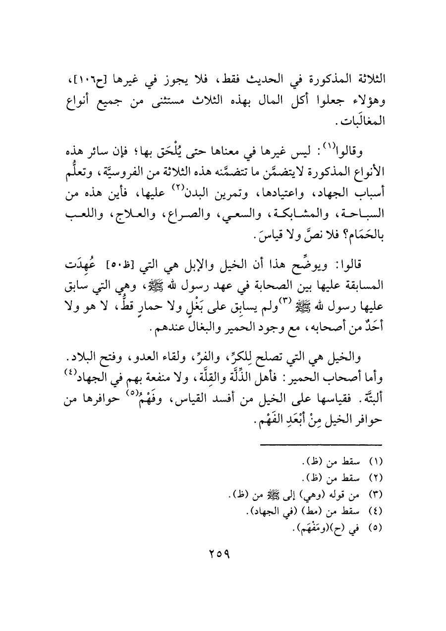 قالوا: ويوضِّح هذا أن الخيل والإبل هي التي [ظ ٥٠] عُهِدَت المسابقة عليها بين الصحابة في عهد رسول لله - صلى الله عليه وسلم -، وهي التي سابق عليها رسول لله - صلى الله عليه وسلم - (¬٣) ولم يسابِق على بَغْلٍ ولا حمارٍ قط، لا هو ولا أحَدٌ من أصحابه، مع وجود الحمير والبغال عندهم.