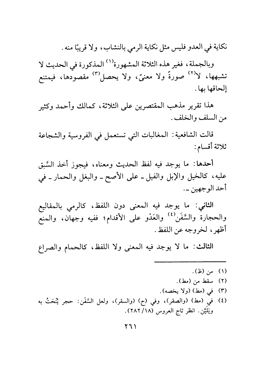 الثاني: ما يوجد فيه المعنى دون اللفظ، كالرمي بالمقاليع والحجارة والسَّفَن (¬٤) والعَدْو على الأقدام؛ ففيه وجهان، والمنع أظهر، لخروجه عن اللفظ.
