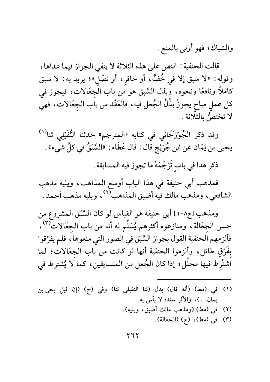 ومذهب [ح ١٠٨] أبي حنيفة هو القياس لو كان السَّبَق المشروع من جنس الجعَالة، ومنازعوه أكثرهم يُسَلِّم له أنه من باب الجعَالات (¬٣)، فألزمهم الحنفية القول بجواز السَّبَق في الصور التي منعوها، فلم يفرِّقوا بِفَرْقٍ طائل، وألزموا الحنفية أنها لو كانت من باب الجِعَالات؛ لما اشتُرِط فيها محلِّل؛ إذا كان الجُعل من المتسابقين، كما لا يُشترط في