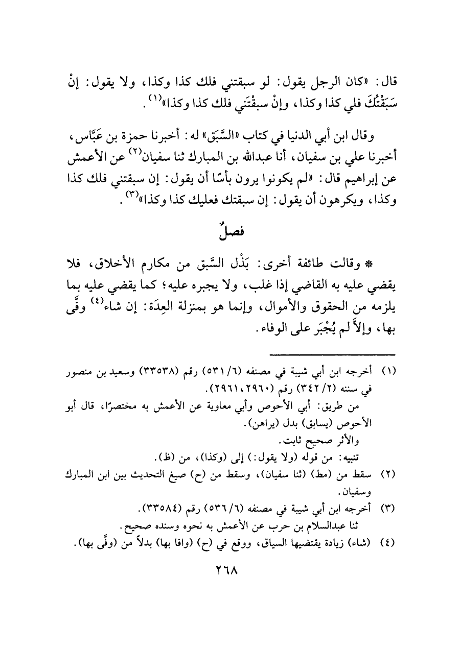 وقال ابن أبي الدنيا في كتاب "السَّبَق" له: أخبرنا حمزة بن عَبَّاس، أخبرنا علي بن سفيان، أنا عبد الله بن المبارك ثنا سفيان (¬٢) عن الأعمش عن إبراهيم قال: "لم يكونوا يرون بأسًا أن يقول: إن سبقتني فلك كذا وكذا، ويكرهون أن يقول: إن سبقتك فعليك كذا وكذا" (¬٣).