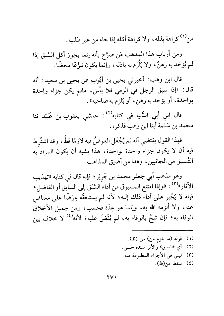 وهو مذهب أبي جعفر محمد بن جَرِيْر؛ فإنه قال في كتابه "تهذيب الآثار" (¬٣): "وإذا امتنع المسبوق من أداء السَّبَق إلى السابق أو الفاضل؛ فإنه لا يُجْبر على أداء ذلك إليه؛ لأنه لم يستحقُّه عِوَضًا على معتاضٍ عنه، ولا ألزمه الله به، وإنما هو عِدَة فحسب، ومن جميل الأخلاق الوفاء به؛ فإن شحَّ بالوفاء به، لم يُقْضَ عليه؛ لأنه (¬٤) لا خلاف بين
