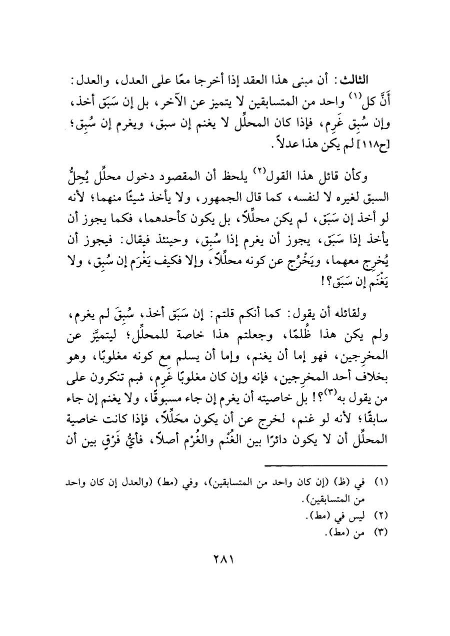 الثالث: أن مبنى هذا العقد إذا أخرجا معًا على العدل، والعدل: أَنَّ كل (¬١) واحد من المتسابقين لا يتميز عن الآخر، بل إن سَبَق أخذ، وإن سُبِق غَرِم، فإذا كان المحلِّل لا يغنم إن سبق، ويغرم إن سُبِق؛ [ح ١١٨] لم يكن هذا عدلًا.