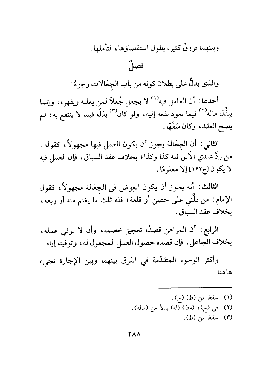 أحدها: أن العامل فيه (¬١) لا يجعل جُعلًا لمن يغلبه ويقهره، وإنما يبذُل ماله (¬٢) فيما يعود نفعه إليه، ولو كان (¬٣) بذلُه فيما لا ينتفع به؛ لم يصح العقد، وكان سَفَهًا.