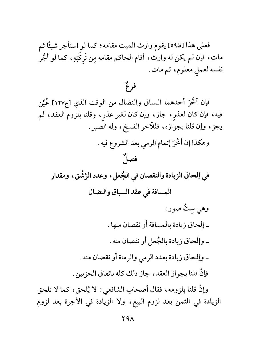 فصلٌ في إلحاق الزيادة والنقصان في الجُعل، وعدد الرَّشْق، ومقدار المسافة في عقد السباق والنضال