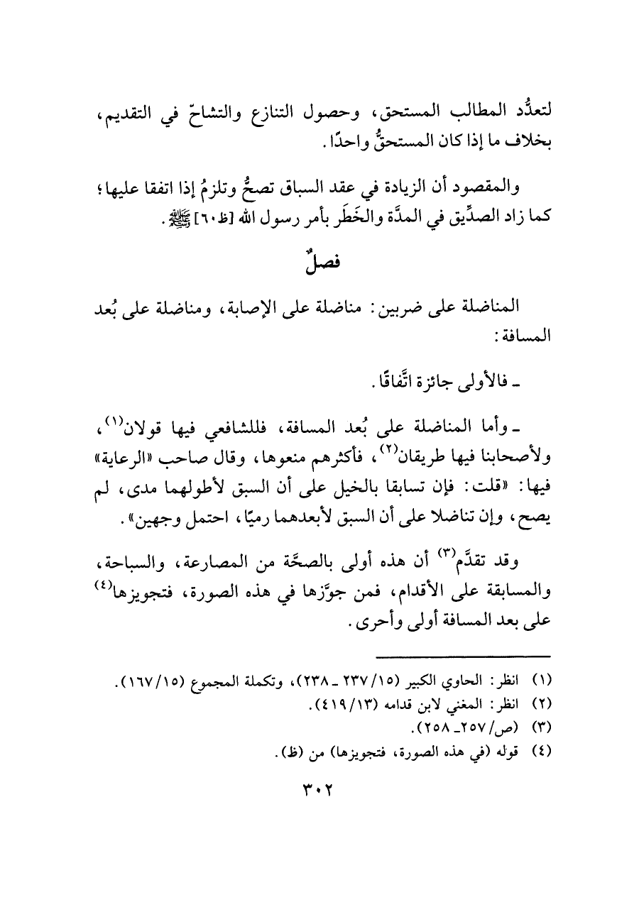 والمقصود أن الزيادة في عقد السباق تصحُّ وتلزمُ إذا اتفقا عليها؛ كما زاد الصدَّيق في المدَّة والخَطَر بأمر رسول الله [ظ ٦٠]- صلى الله عليه وسلم -.