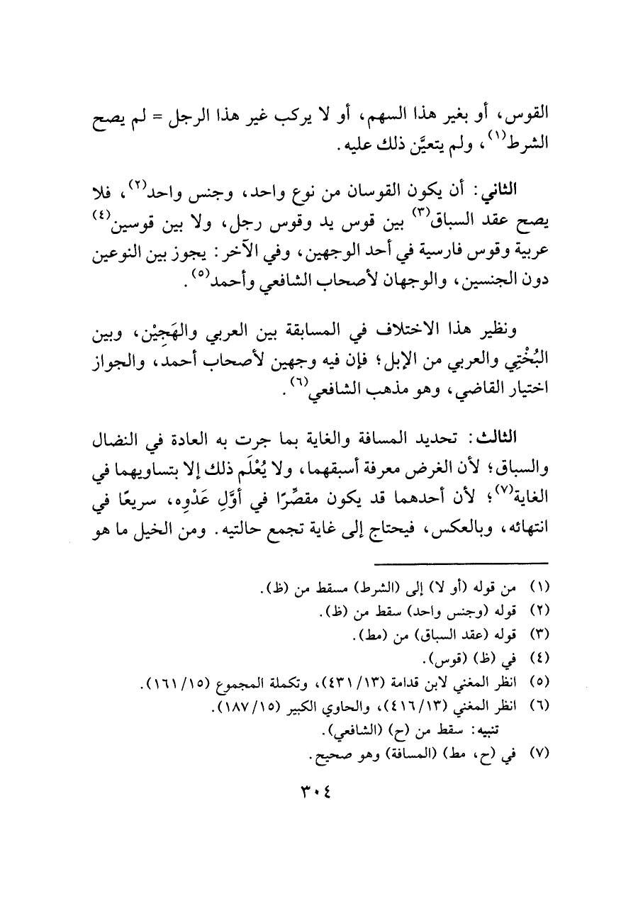 الثاني: أن يكون القوسان من نوع واحد، وجنس واحد (¬٢)، فلا يصح عقد السباق (¬٣) بين قوس يد وقوس رجل، ولا بين قوسين (¬٤) عربية وقوس فارسية في أحد الوجهين، وفي الآخر: يجوز بين النوعين دون الجنسين، والوجهان لأصحاب الشافعي وأحمد (¬٥).