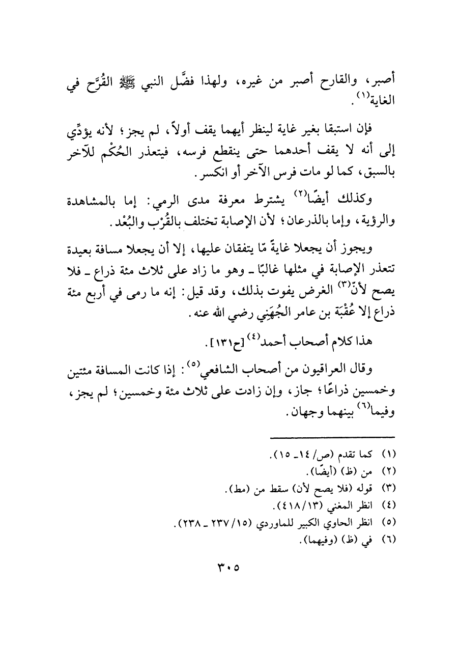 ويجوز أن يجعلا غايةً مّا يتفقان عليها، إلا أن يجعلا مسافة بعيدة تتعذر الإصابة في مثلها غالبًا - وهو ما زاد على ثلاث مئة ذراع - فلا يصح لأنّ (¬٣) الغرض يفوت بذلك، وقد قيل: إنه ما رمى في أربع مئة ذراع إلا عُقْبَة بن عامر الجُهَنِي رضي الله عنه.