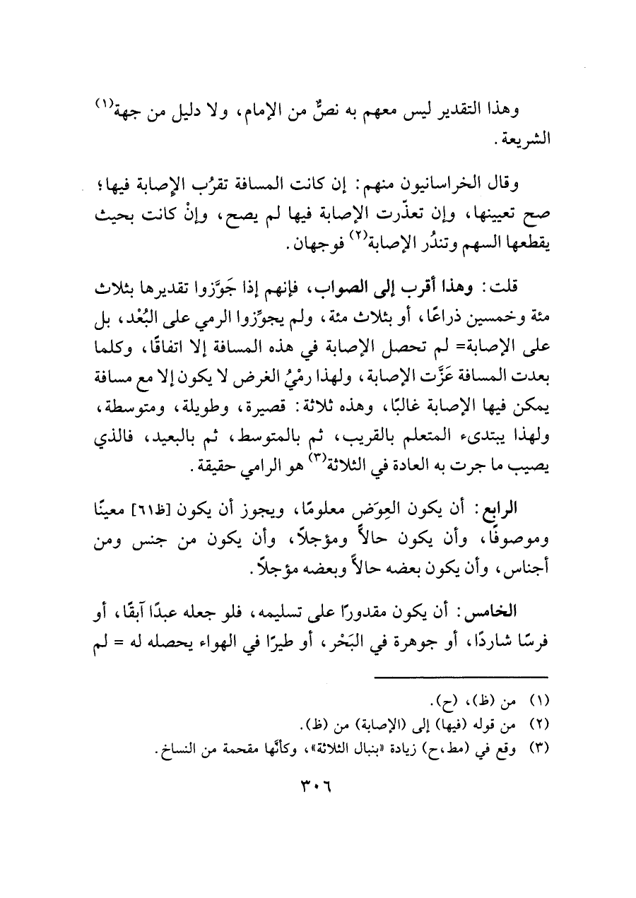 قلت: وهذا أقرب إلى الصواب، فإنهم إذا جَوَّزوا تقديرها بثلاث مئة وخمسين ذراعًا، أو بثلاث مئة، ولم يجوِّزوا الرمي على البُعْد، بل على الإصابة = لم تحصل الإصابة في هذه المسافة إلا اتفاقًا، وكلما بعدت المسافة عَزَّت الإصابة، ولهذا رمْيُ الغرض لا يكون إلا مع مسافة يمكن فيها الإصابة غالبًا، وهذه ثلاثة: قصيرة، وطويلة، ومتوسطة، ولهذا يبتدئ المتعلم بالقريب، ثم بالمتوسط، ثم بالبعيد، فالذي يصيب ما جرت به العادة في الثلاثة (¬٣) هو الرامي حقيقة.