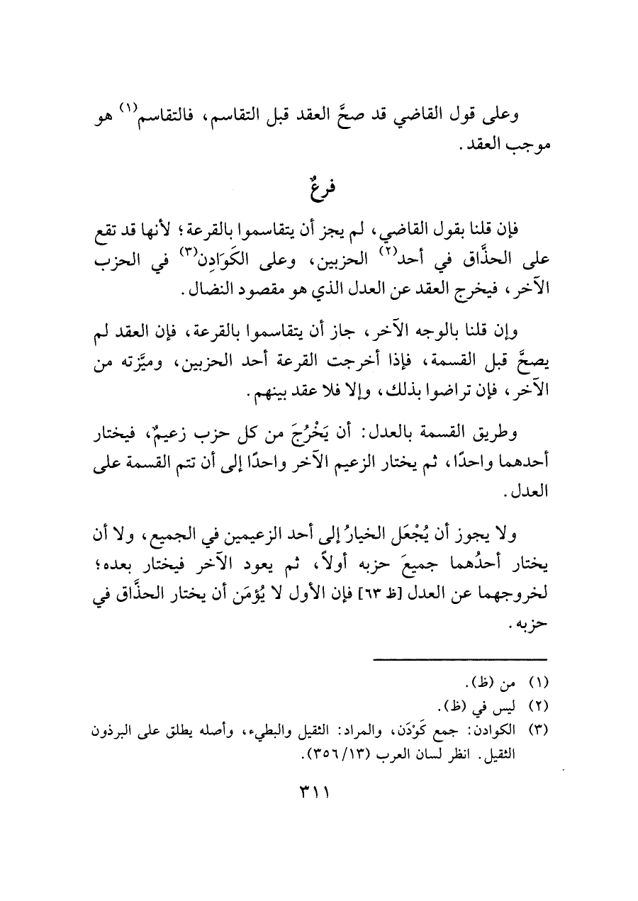 ولا يجوز أن يُجْعَل الخيارُ إلى أحد الزعيمين في الجميع، ولا أن يختار أحدُهما جميعَ حزبه أولًا، ثم يعود الآخر فيختار بعده؛ لخروجهما عن العدل [ظ ٦٣] فإن الأول لا يُؤمَن أن يختار الحذَّاق في حزبه.