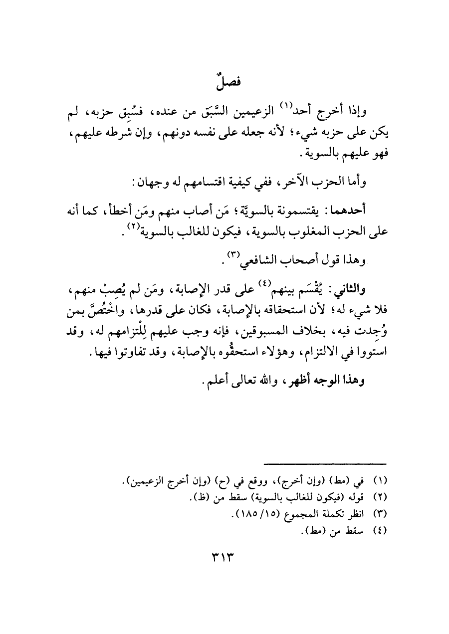 أحدهما: يقتسمونه بالسويَّة؛ مَن أصاب منهم ومَن أخطأ، كما أنه على الحزب المغلوب بالسوية، فيكون للغالب بالسوية (¬٢).