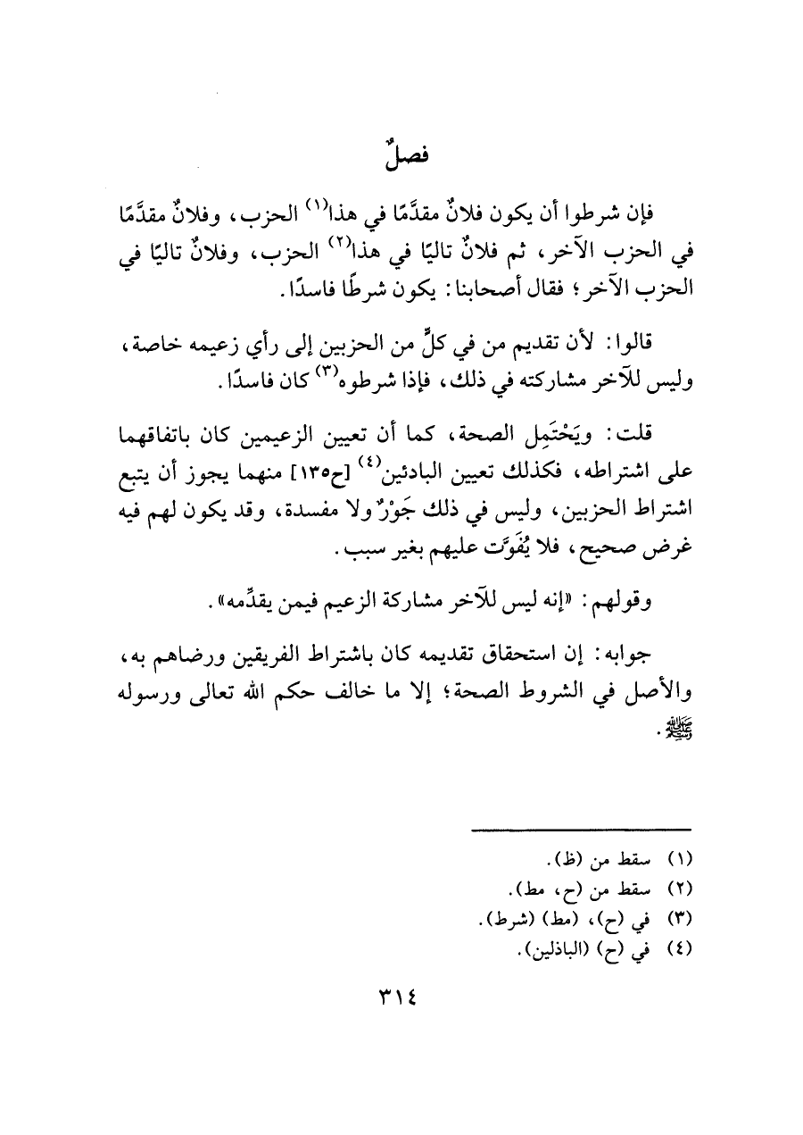 فإن شرطوا أن يكون فلانٌ مقدَّمًا في هذا (¬١) الحزب، وفلانٌ مقدَّمًا في الحزب الآخر، ثم فلانٌ تاليًا في هذا (¬٢) الحزب، وفلانٌ تاليًا في الحزب الآخر؛ فقال أصحابنا: يكون شرطًا فاسدًا.