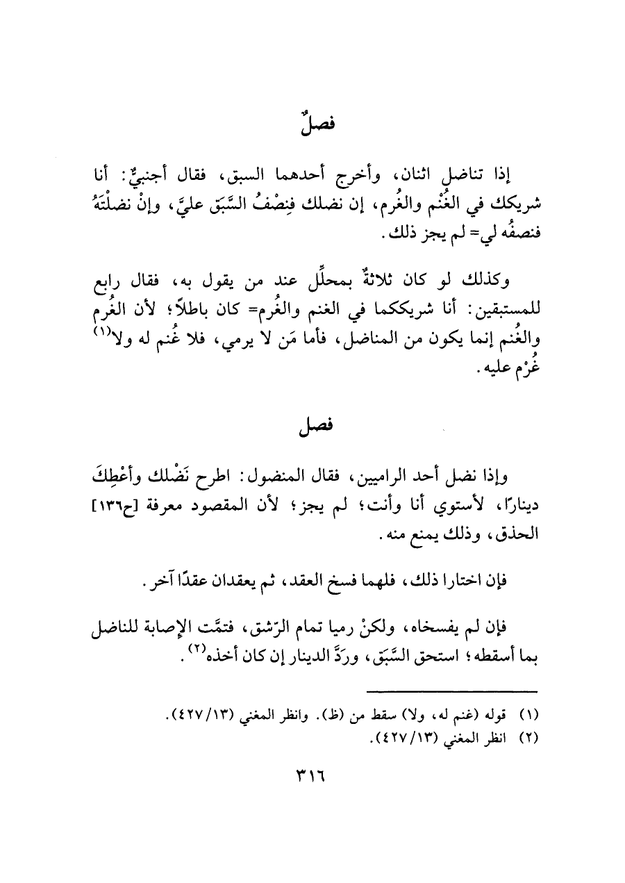 وكذلك لو كان ثلاثةٌ بمحلِّل عند من يقول به، فقال رابع للمستبقين: أنا شريككما في الغنم والغُرم = كان باطلًا؛ لأن الغُرم والغُنم إنما يكون من المناضل، فأما مَن لا يرمي، فلا غُنم له ولا (¬١) غُرْم عليه.