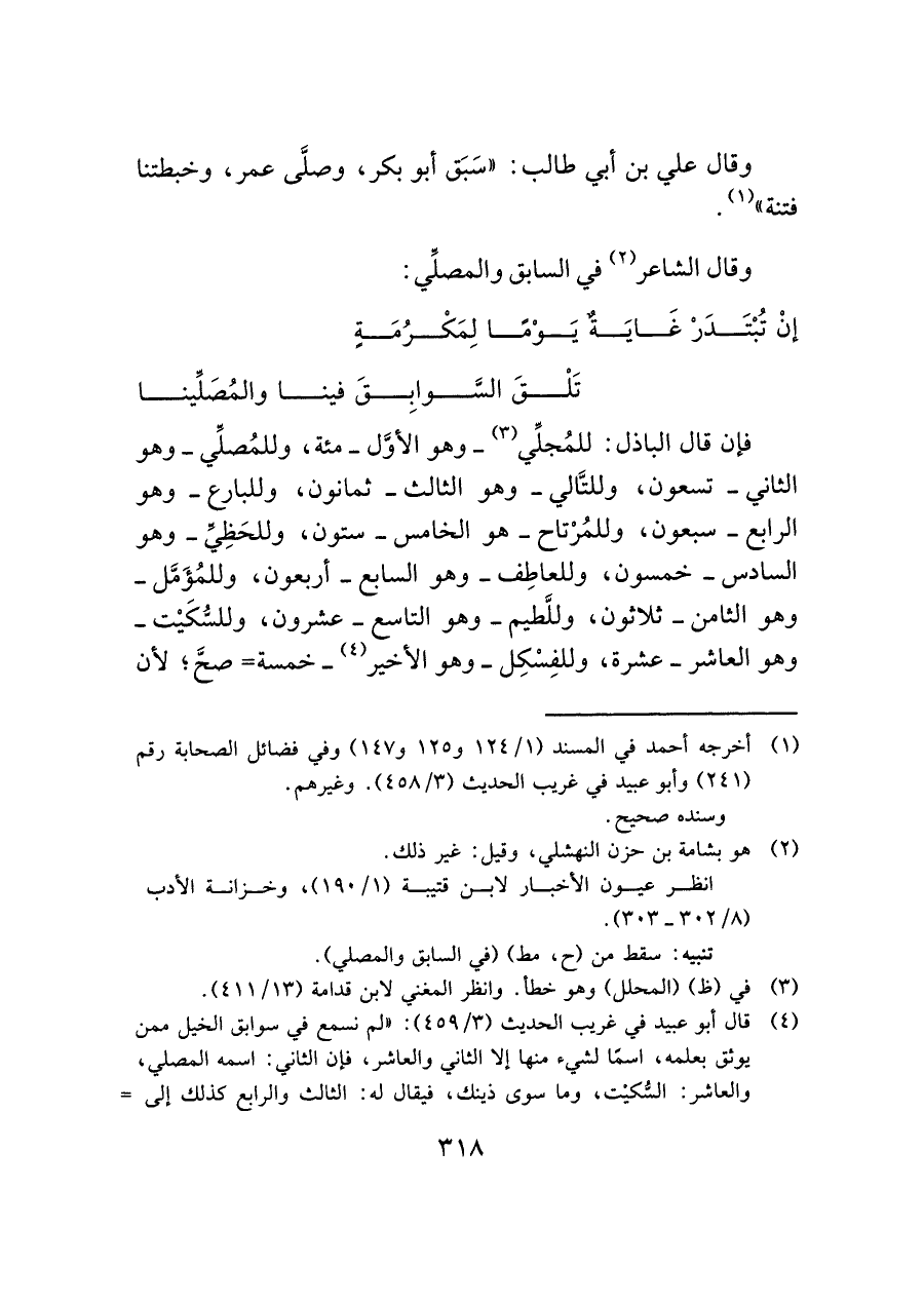 (¬٤) قال أبو عبيد في غريب الحديث (٣/ ٤٥٩): "لم نسمع في سوابق الخيل ممن يوثق بعلمه، اسمًا لشيء منها إلا الثاني والعاشر، فإن الثاني: اسمه المصلي، والعاشر: السُّكيْت، وما سوى ذينك، فيقال له: الثالث والرابع كذلك إلى =