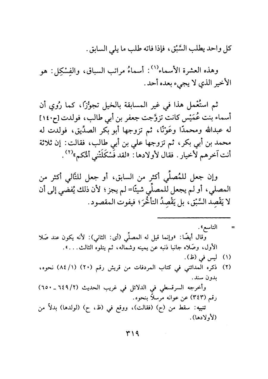 ثم استُعْمل هذا في غير المسابقة بالخيل تجوُّزًا، كما رُوي أن أسماء بنت عُمَيْس كانت تزوَّجت جعفر بن أبي طالب، فولدت [ح ١٤٠] له عبد الله ومحمدًا وعَوْنًا، ثم تزوجها أبو بكر الصدِّيق، فولدت له محمد بن أبي بكر، ثم تزوجها علي بن أبي طالب، فقالت: إن ثلاثة أنت آخرهم لأخيار. فقال لأولادها: "لقد فَسْكَلَتْني أمُّكم" (¬٢).