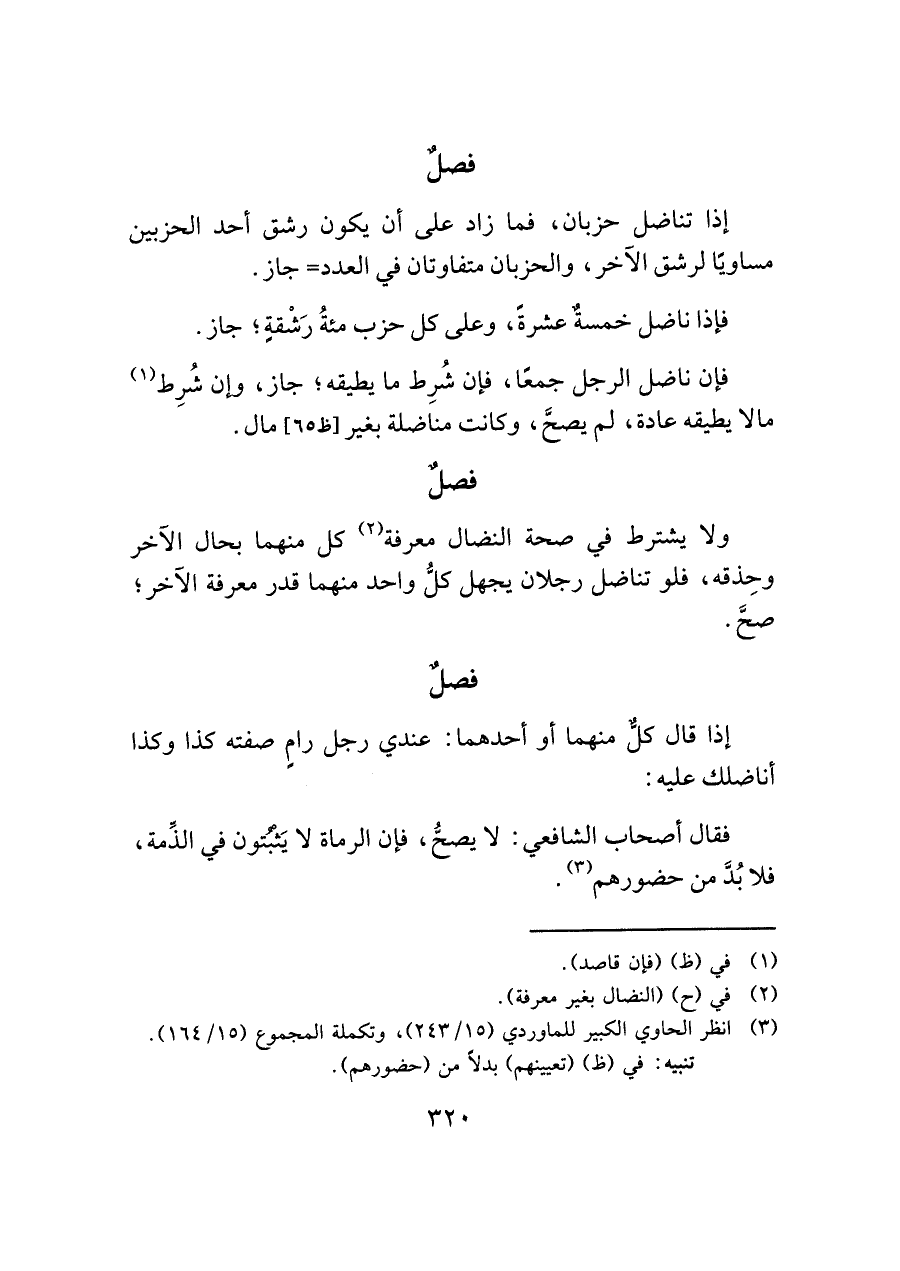 إذا تناضل حزبان، فما زاد على أن يكون رشق أحد الحزبين مساويًا لرشق الآخر، والحزبان متفاوتان في العدد = جاز.