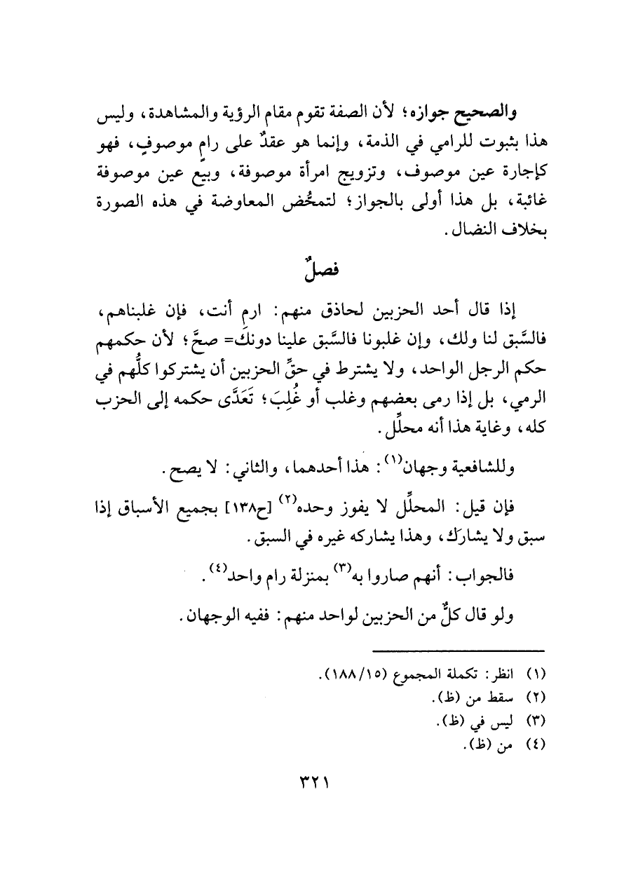 إذا قال أحد الحزبين لحاذق منهم: ارمِ أنت، فإن غلبناهم، فالسَّبق لنا ولك، وإن غلبونا فالسَّبق علينا دونك = صحَّ؛ لأن حكمهم حكم الرجل الواحد، ولا يشترط في حقَّ الحزبين أن يشتركوا كلُّهم في الرمي، بل إذا رمى بعضهم وغلب أو غُلِبَ؛ تَعَدَّى حكمه إلى الحزب كله، وغاية هذا أنه محلِّل.