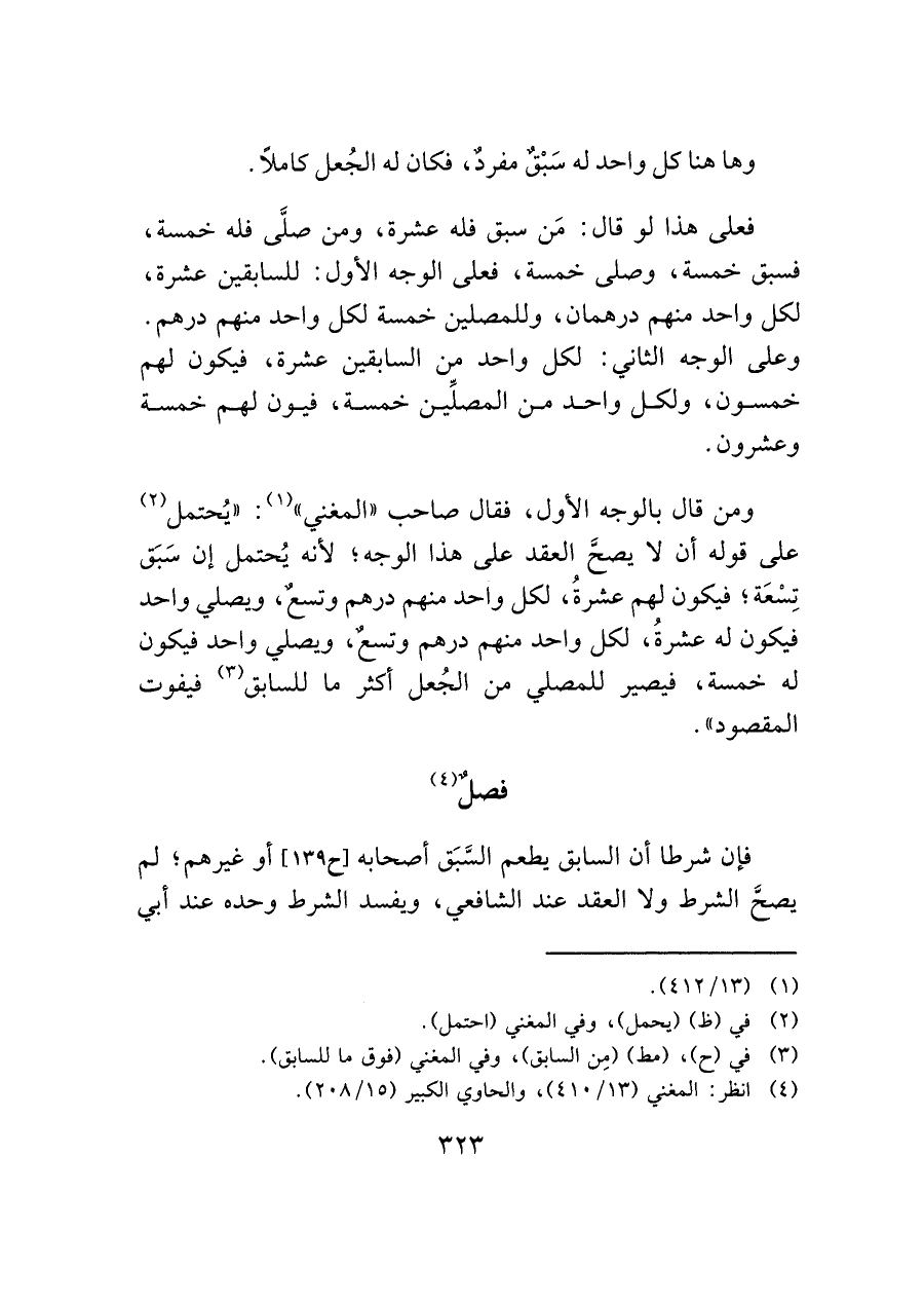 ومن قال بالوجه الأول، فقال صاحب "المغني" (¬١): "يُحتمل (¬٢) على قوله أن لا يصحَّ العقد على هذا الوجه؛ لأنه يُحتمل إن سَبَق تِسْعَة؛ فيكون لهم عشرةُ، لكل واحد منهم درهم وتسعٌ، ويصلي واحد فيكون له عشرةُ، لكل واحد منهم درهم وتسعٌ، ويصلي واحد فيكون له خمسة، فيصير للمصلي من الجُعل أكثر ما للسابق (¬٣) فيفوت المقصود".