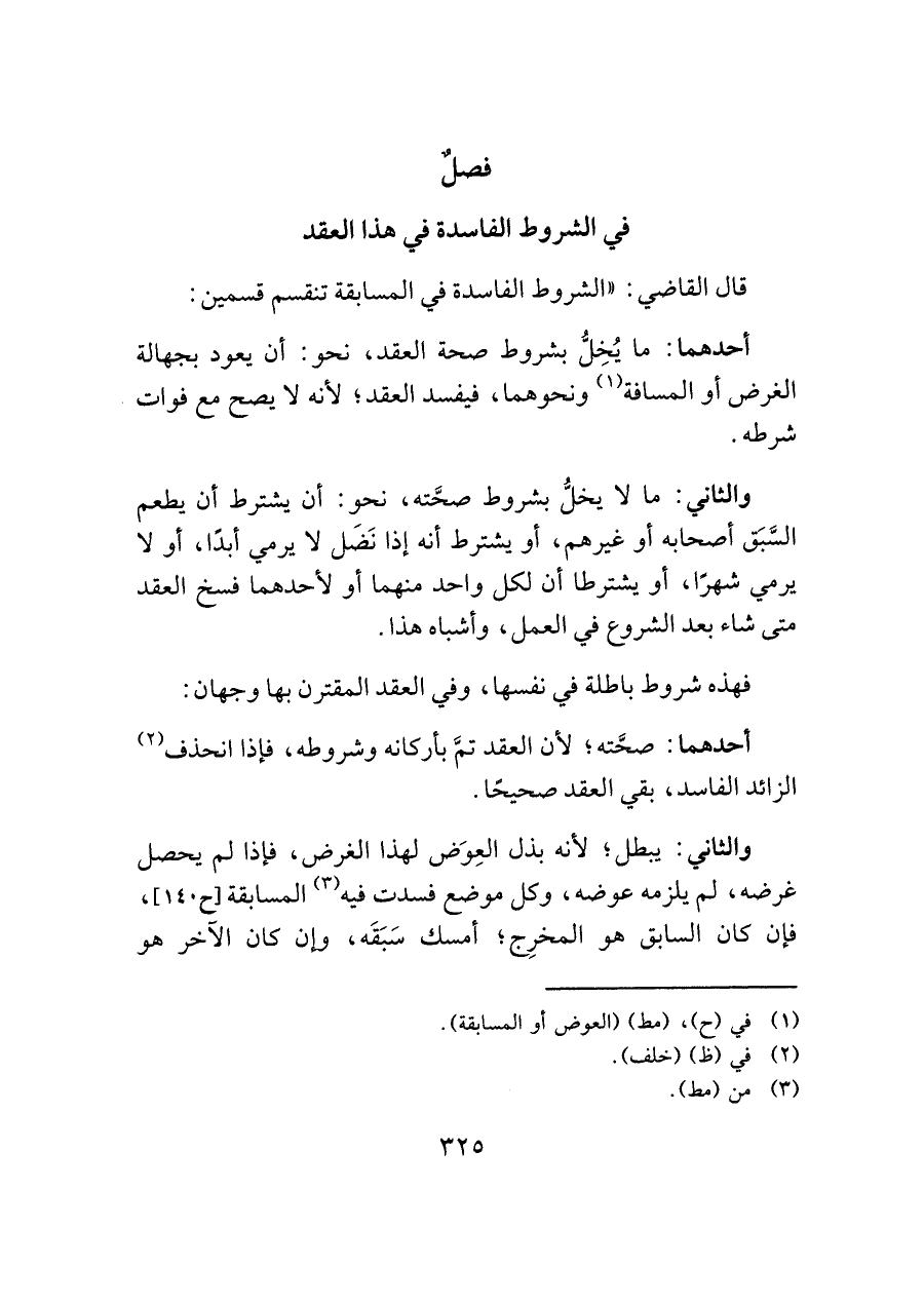 قال القاضي: "الشروط الفاسدة في المسابقة تنقسم قسمين: