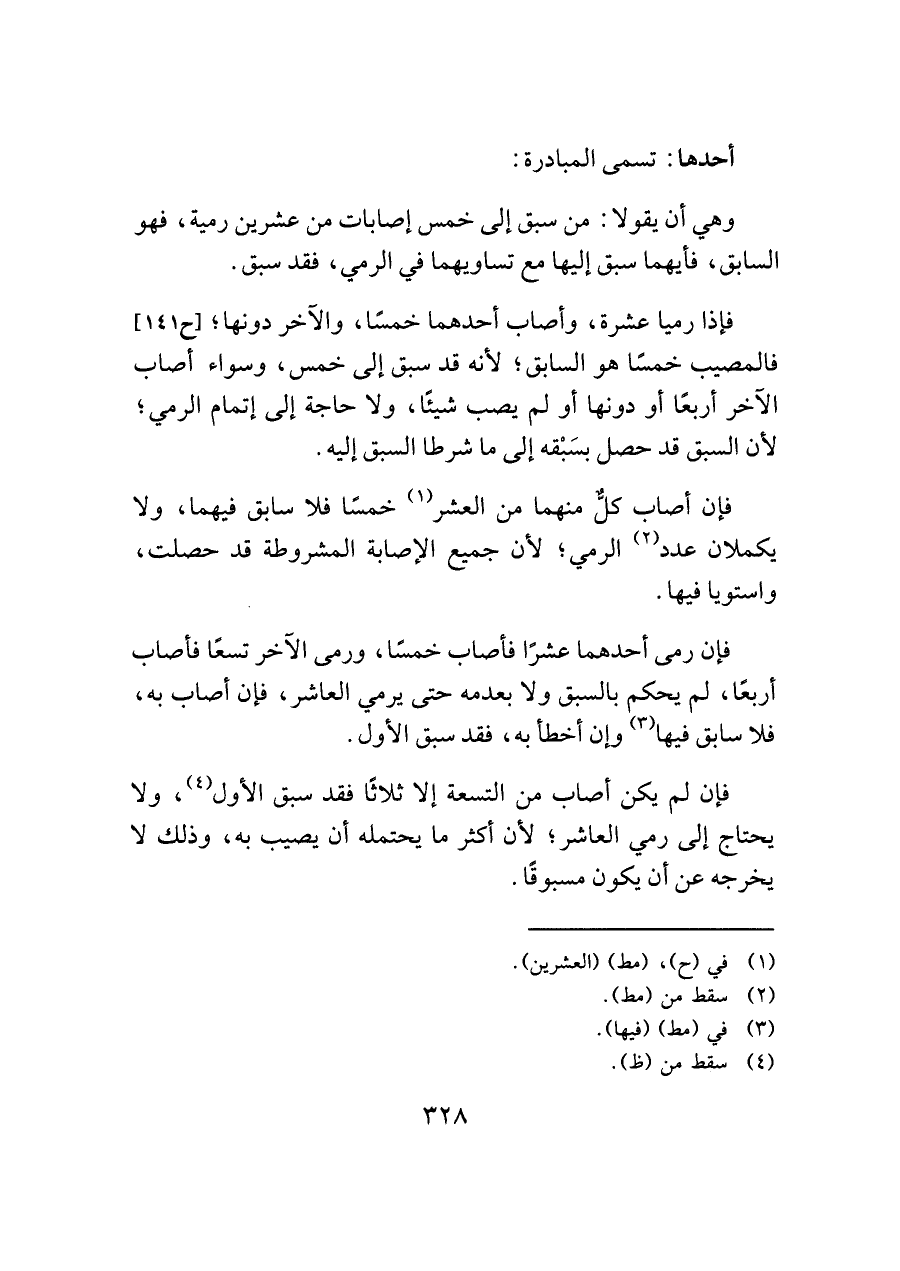 وهي أن يقولا: من سبق إلى خمس إصابات من عشرين رمية، فهو السابق، فأيهما سبق إليها مع تساويهما في الرمي، فقد سبق.