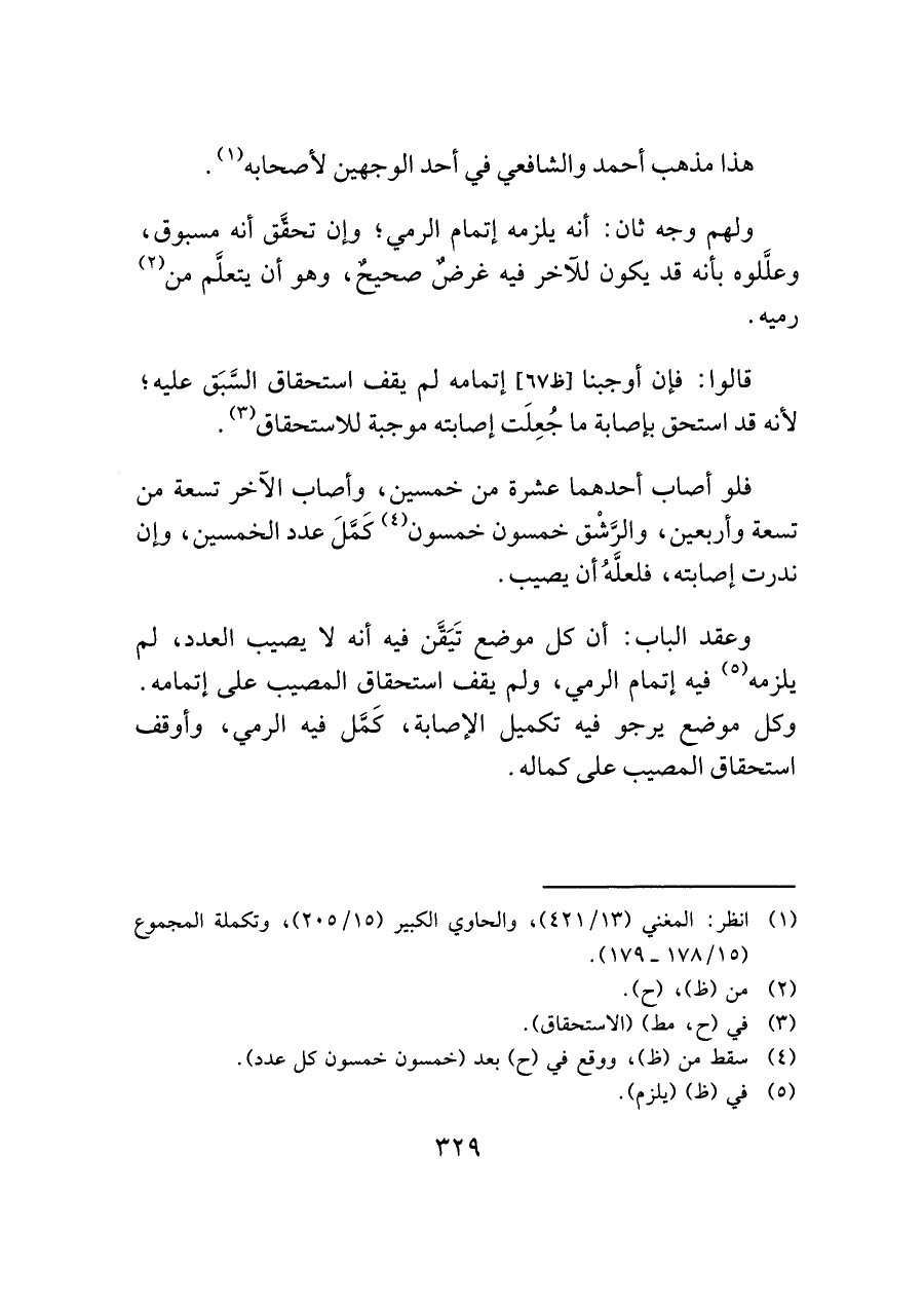 قالوا: فإن أوجبنا [ظ ٦٧] إتمامه لم يقف استحقاق السَّبَق عليه؛ لأنه قد استحق بإصابة ما جُعِلَت إصابته موجبة للاستحقاق (¬٣).