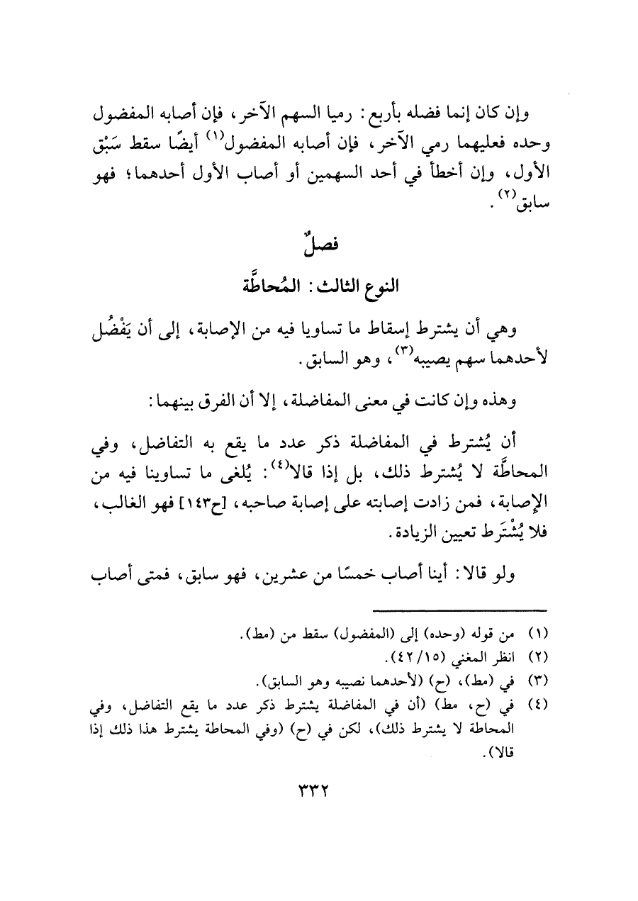 (¬٤) في (ح، مط) (أن في المفاضلة يشترط ذكر عدد ما يقع التفاضل، وفي المحاطة لا يشترط ذلك)، لكن في (ح) (وفي المحاطة يشترط هذا ذلك إذا قالا).
