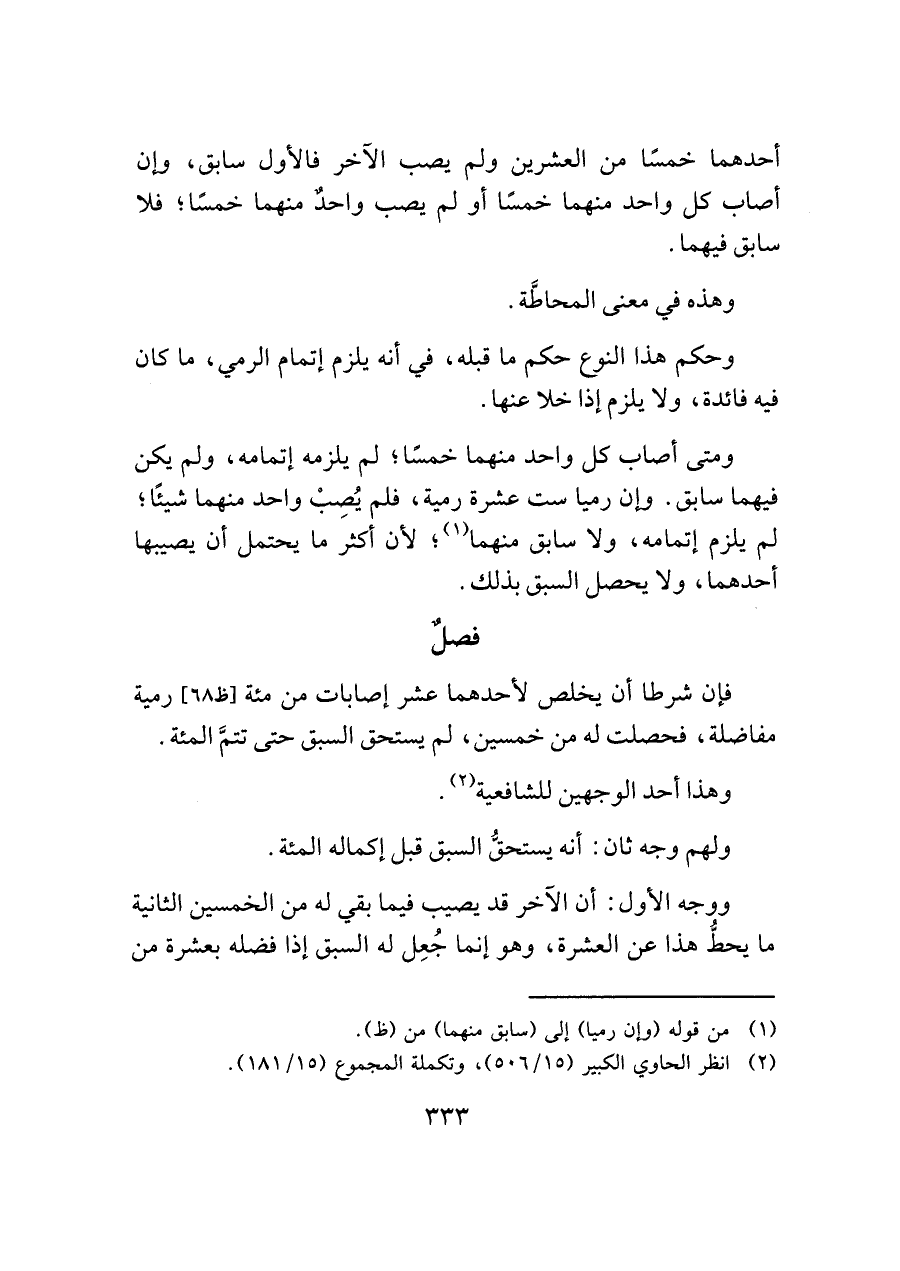 ووجه الأول: أن الآخر قد يصيب فيما بقي له من الخمسين الثانية ما يحطُّ هذا عن العشرة، وهو إنما جُعِل له السبق إذا فضله بعشرة من