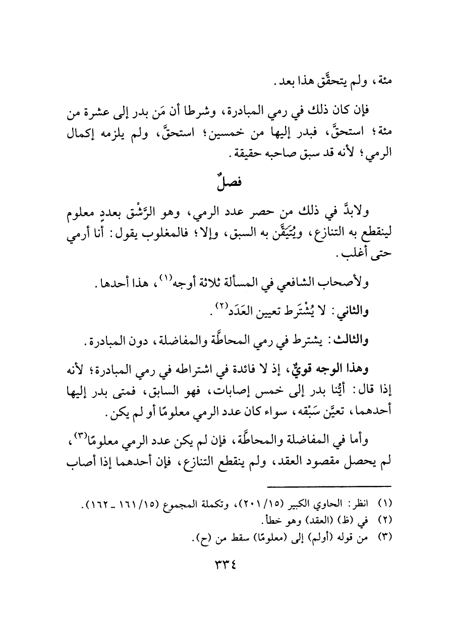 وأما في المفاضلة والمحاطَّة، فإن لم يكن عدد الرمي معلومًا (¬٣)، لم يحصل مقصود العقد، ولم ينقطع التنازع، فإن أحدهما إذا أصاب