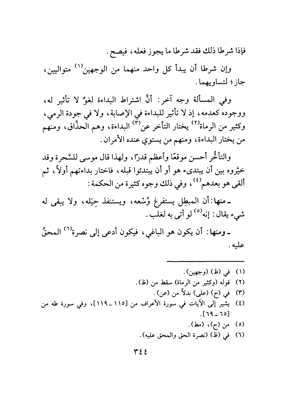 وفي المسألة وجه آخر: أنَّ اشتراط البداءة لغوٌ لا تأثير له، ووجوده كعدمه، إذ لا تأثير للبداءة في الإصابة، ولا في جودة الرمي، وكثير من الرماة (¬٢) يختار التأخر عن (¬٣) البداءة، وهم الحذَّاق، ومنهم من يختار البداءة، ومنهم من يستوي عنده الأمران.