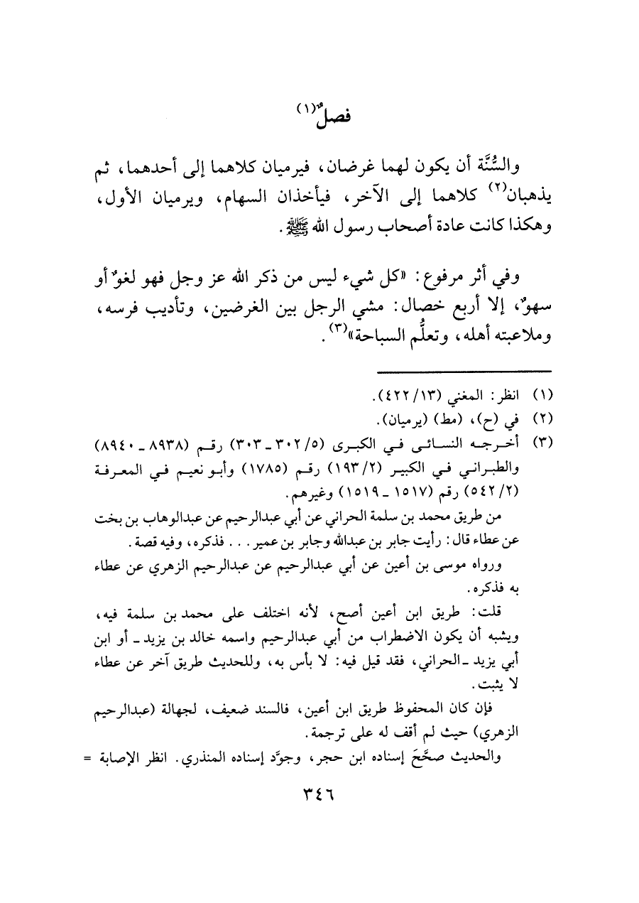 وفي أثر مرفوع: "كل شيء ليس من ذكر الله عز وجل فهو لغوٌ أو سهوٌ، إلا أربع خصال: مشي الرجل بين الغرضين، وتأديب فرسه، وملاعبته أهله، وتعلُّم السباحة" (¬٣).