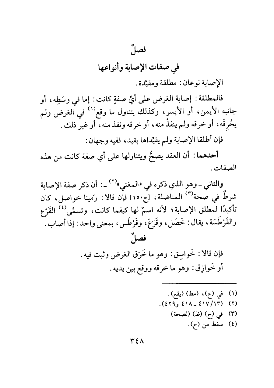 فالمطلقة: إصابة الغرض على أيِّ صفةٍ كانت: إما في وسَطِه، أو جانبه الأيمن، أو الأيسر، وكذلك يتناول ما وقع (¬١) في الغرض ولم يخْرِقْه، أو خرقه ولم ينفذْ منه، أو خرقه ونفذ منه، أو غير ذلك.
