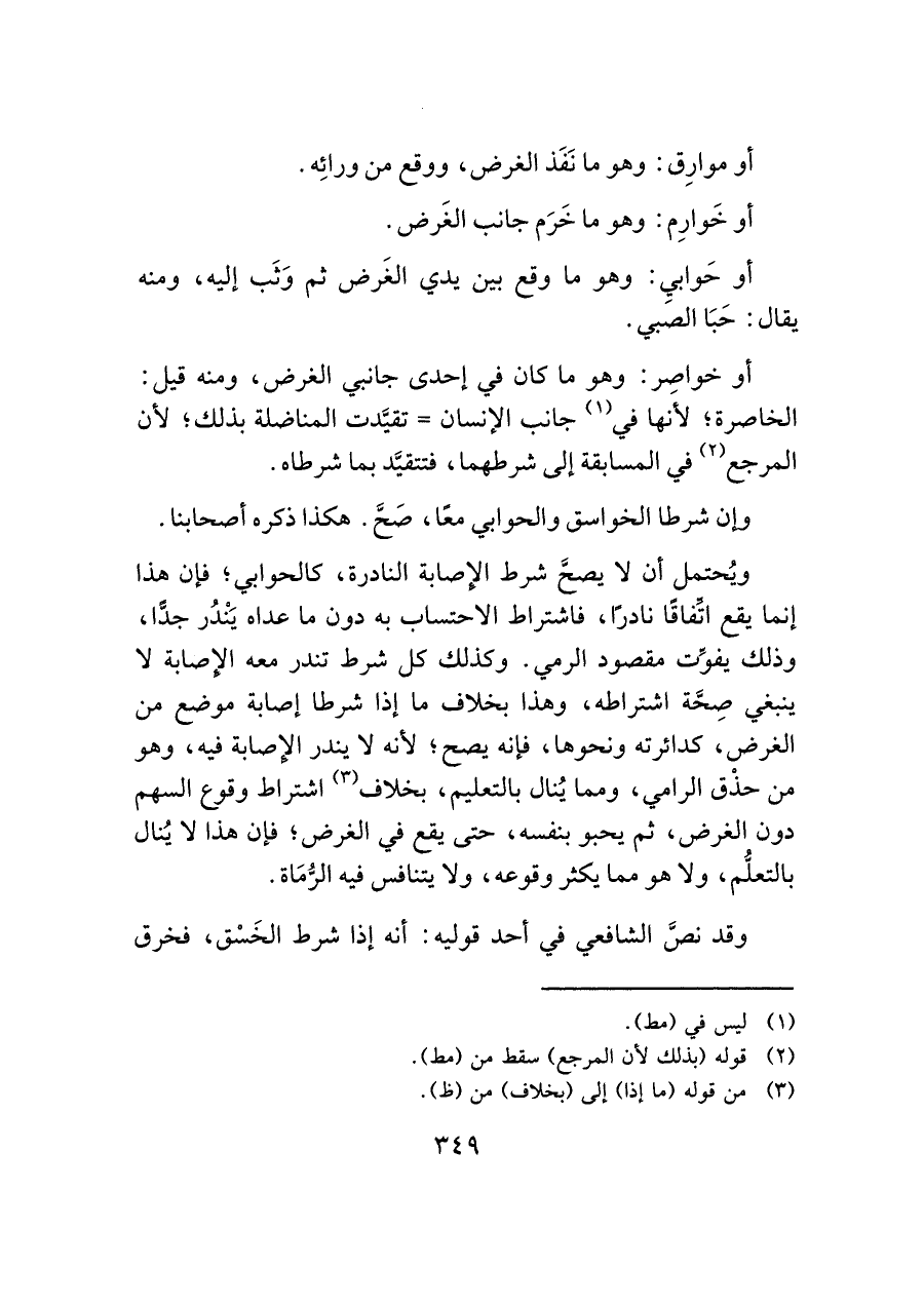 أو خواصِر: وهو ما كان في إحدى جانبي الغرض، ومنه قيل: الخاصرة؛ لأنها في (¬١) جانب الإنسان = تقيَّدت المناضلة بذلك؛ لأن المرجع (¬٢) في المسابقة إلى شرطهما، فتتقيَّد بما شرطاه.