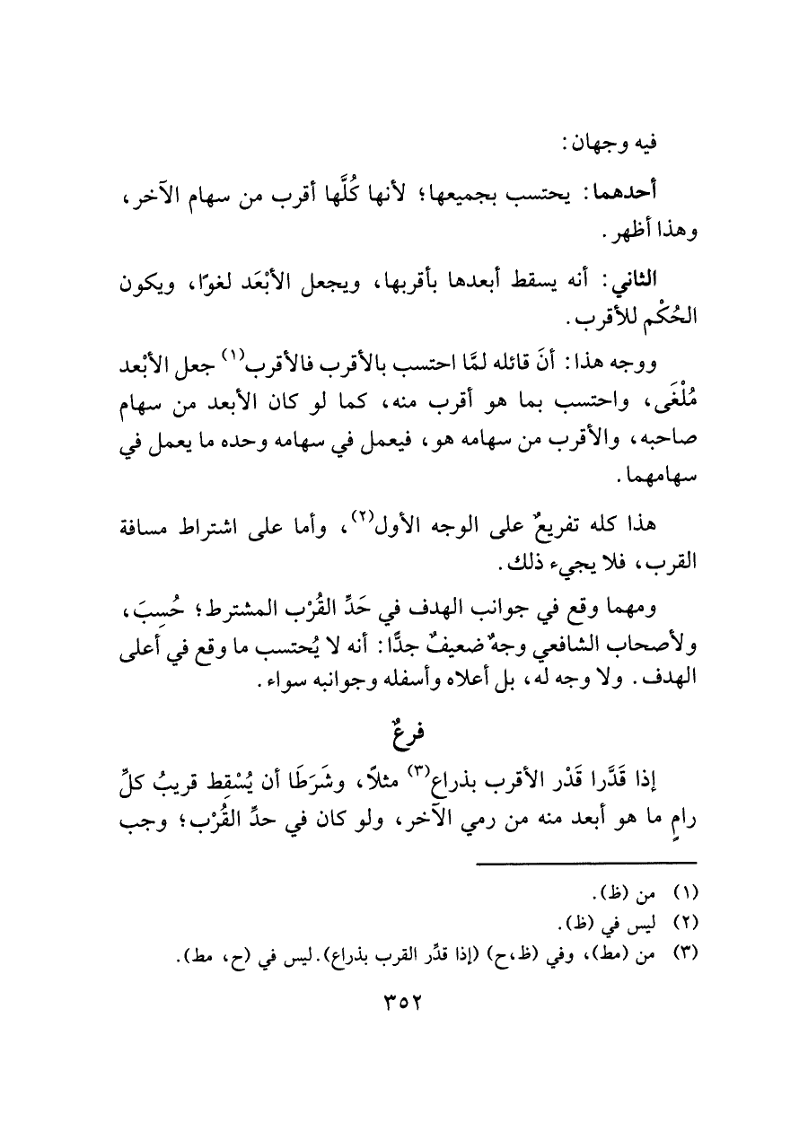 ومهما وقع في جوانب الهدف في حَدِّ القُرْب المشترط؛ حُسِبَ، ولأصحاب الشافعي وجهٌ ضعيفٌ جدًّا: أنه لا يُحتسب ما وقع في أعلى الهدف. ولا وجه له، بل أعلاه وأسفله وجوانبه سواء.