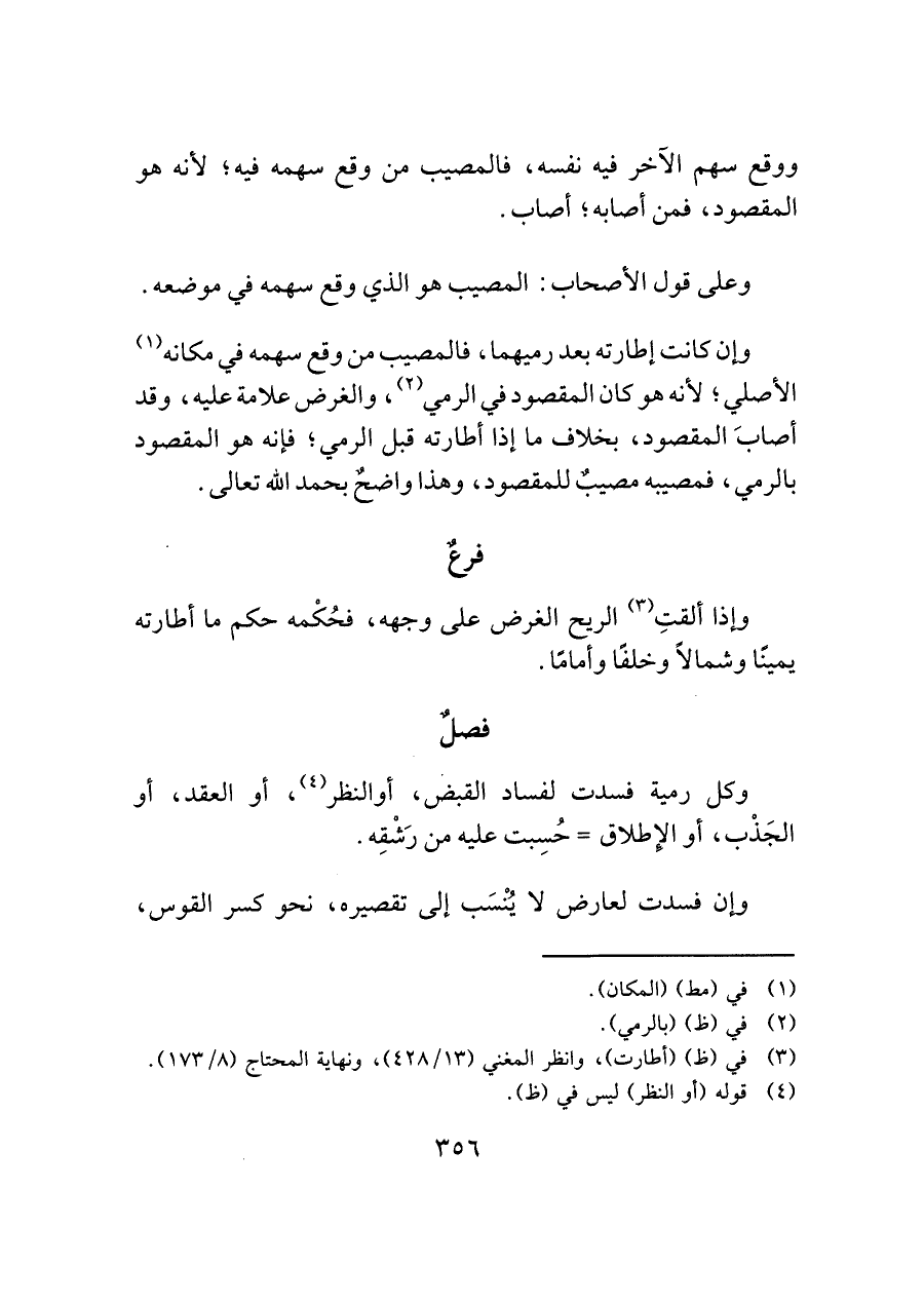 وإن كانت إطارته بعد رميهما، فالمصيب من وقع سهمه في مكانه (¬١) الأصلي؛ لأنه هو كان المقصود في الرمي (¬٢)، والغرض علامة عليه، وقد أصابَ المقصود، بخلاف ما إذا أطارته قبل الرمي؛ فإنه هو المقصود بالرمي، فمصيبه مصيبٌ للمقصود، وهذا واضحٌ بحمد الله تعالى.