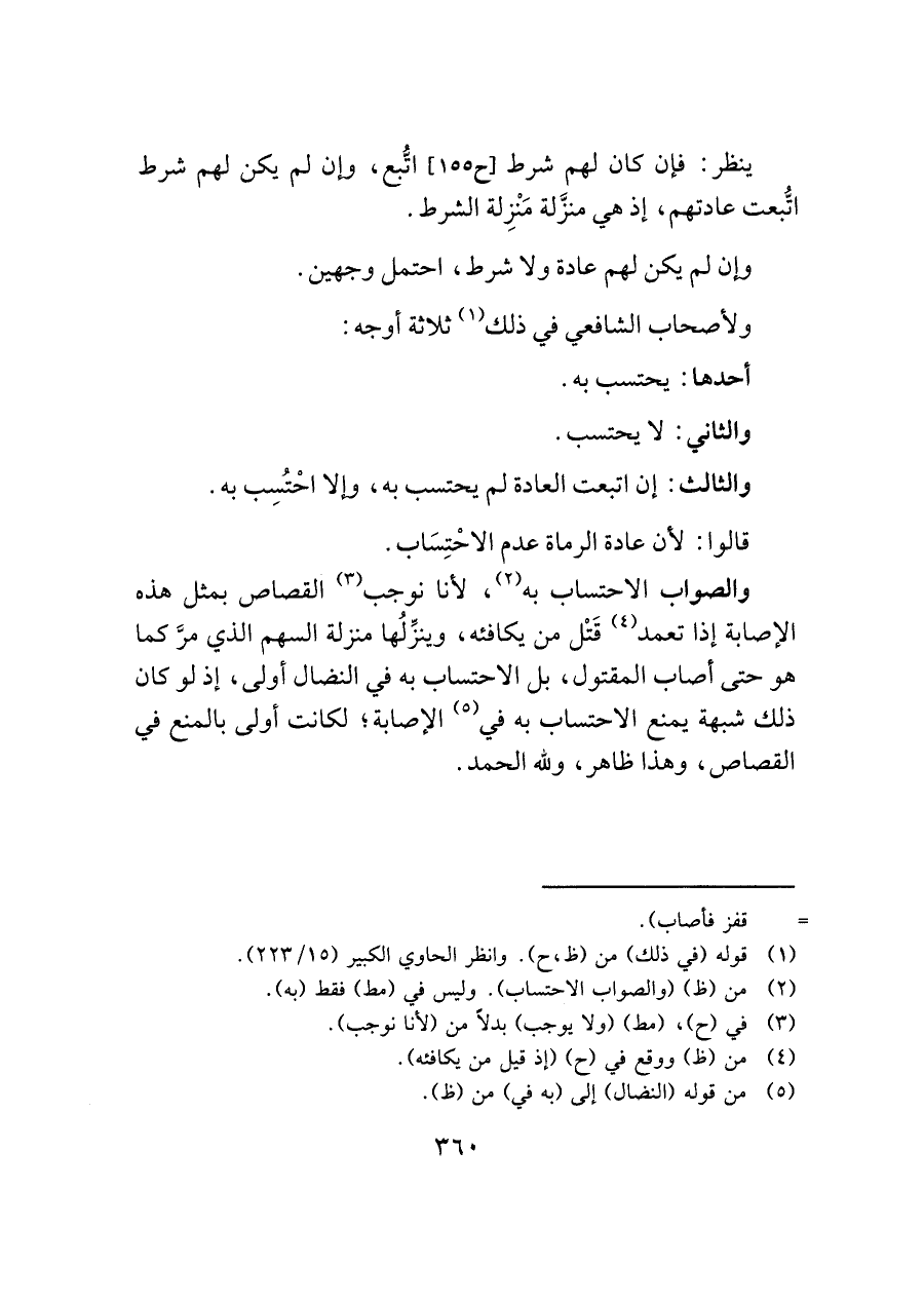 والصواب الاحتساب به (¬٢)، لأنا نوجب (¬٣) القصاص بمثل هذه الإصابة إذا تعمد (¬٤) قَتْل من يكافئه، وينزِّلُها منزلة السهم الذي مرَّ كما هو حتى أصاب المقتول، بل الاحتساب به في النضال أولى، إذ لو كان ذلك شبهة يمنع الاحتساب به في (¬٥) الإصابة؛ لكانت أولى بالمنع في القصاص، وهذا ظاهر، ولله الحمد.